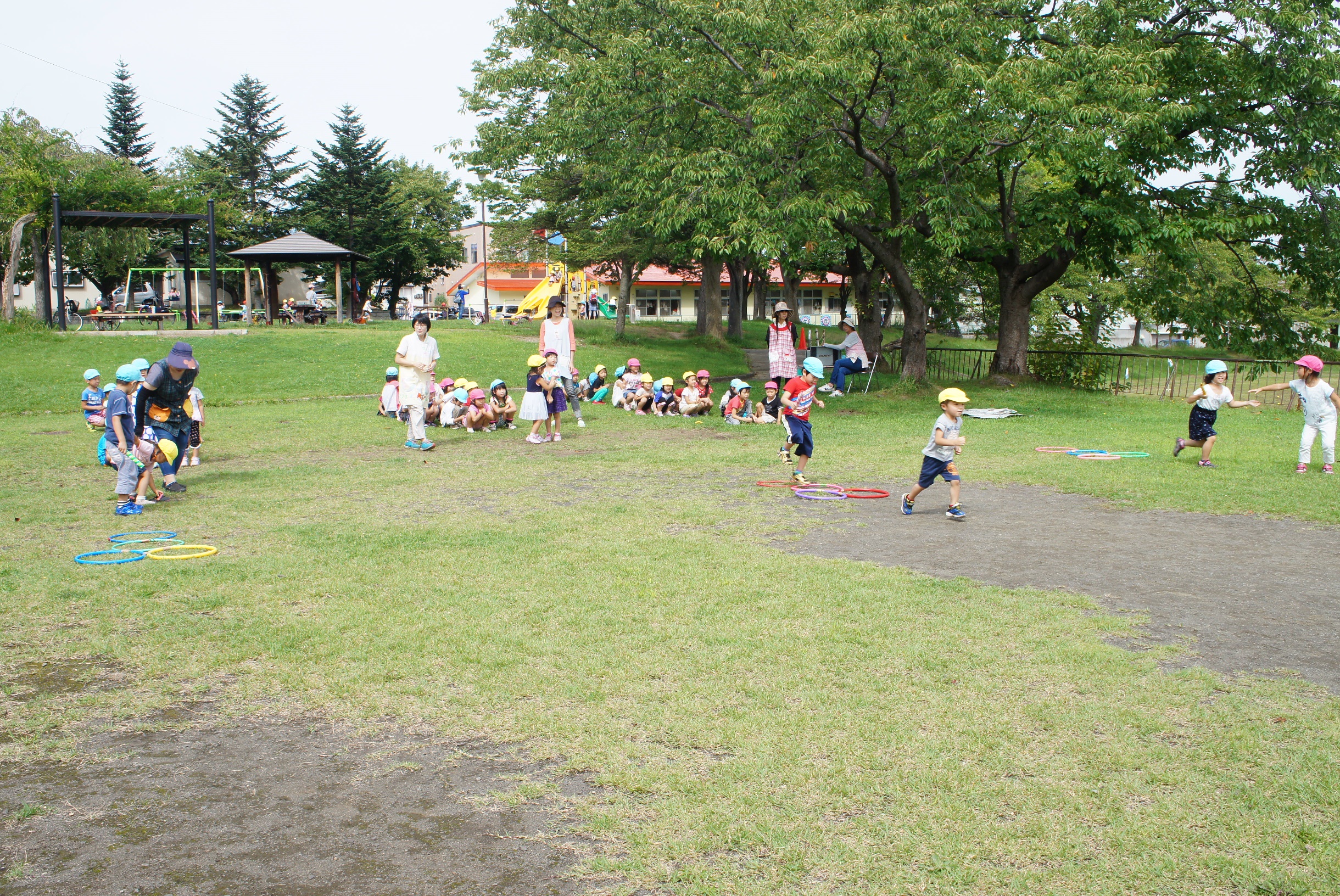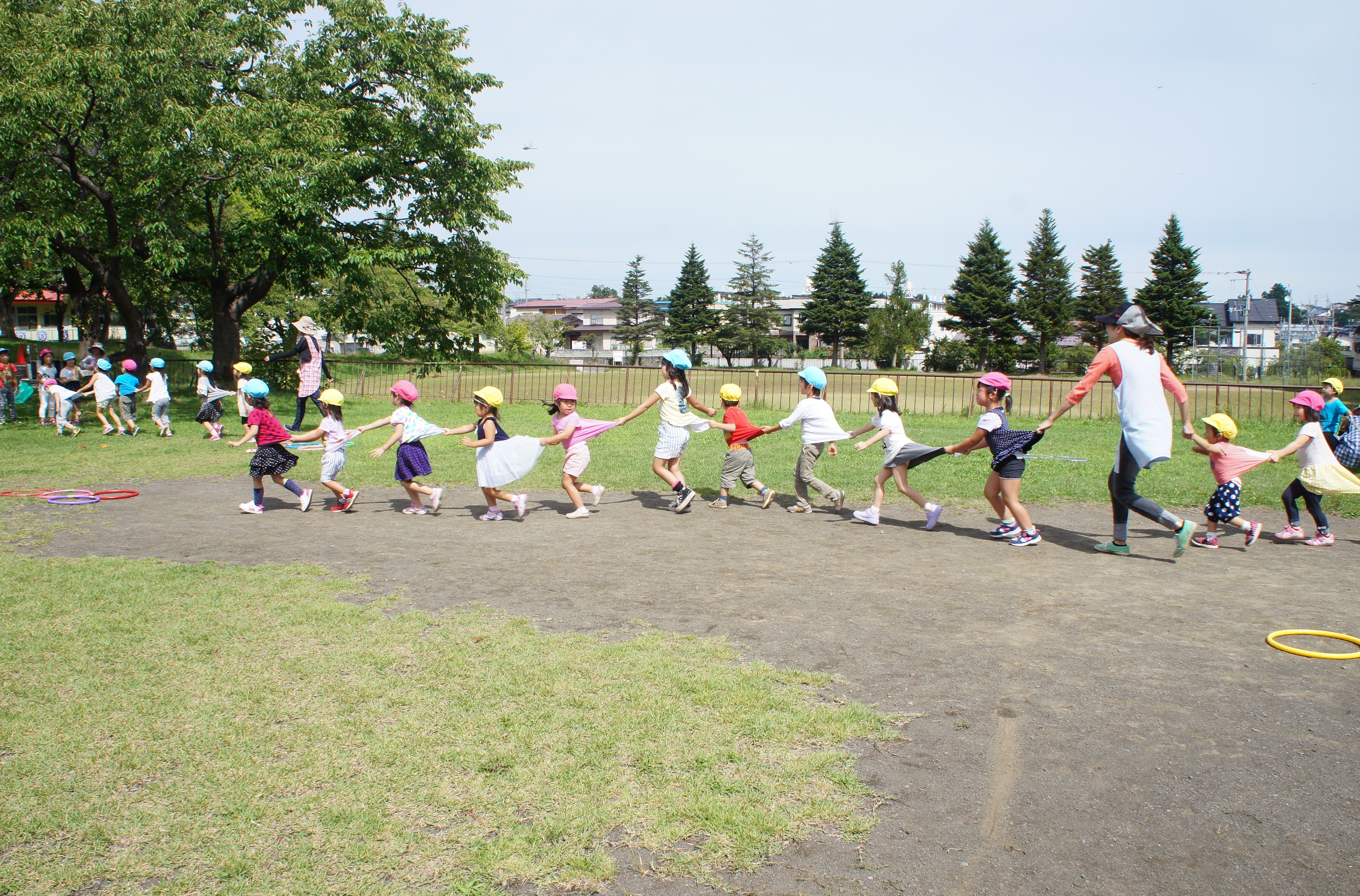 晴天の中、ノリノリのりもの体操を元気いっぱい踊っていました。その後、三チームに分かれて2人一組になり、ケンケンしたりフープ電車でコーンを回ったりと競争をしました。自分のチームを一生懸命応援する姿が見られていましたよ。自由遊びでは異年齢児との交流を思い切り楽しんでいました。