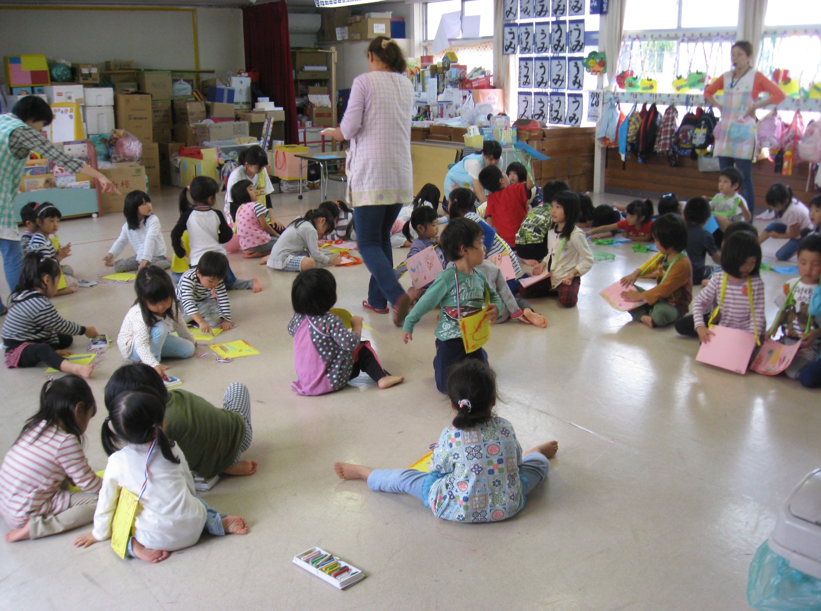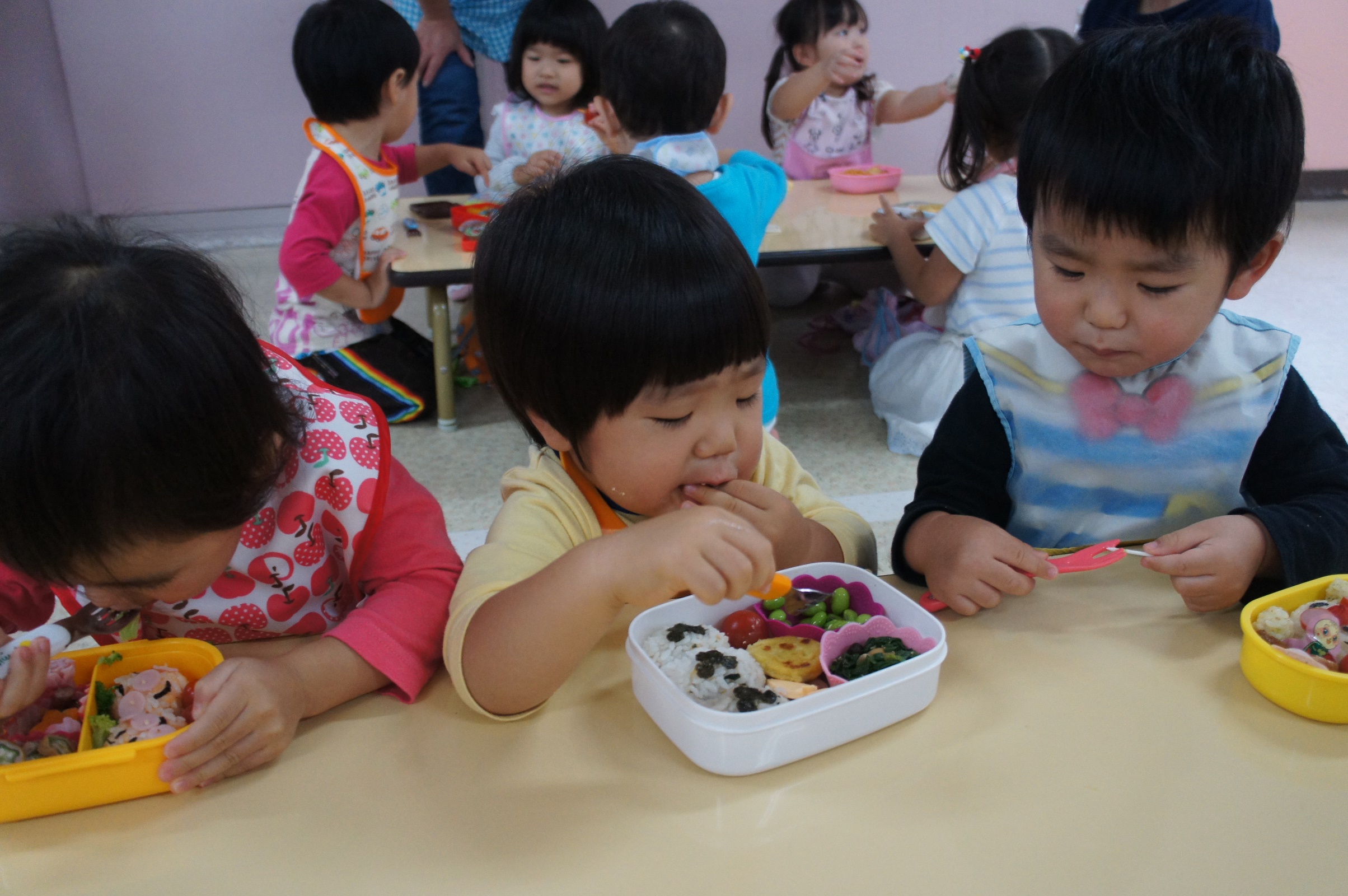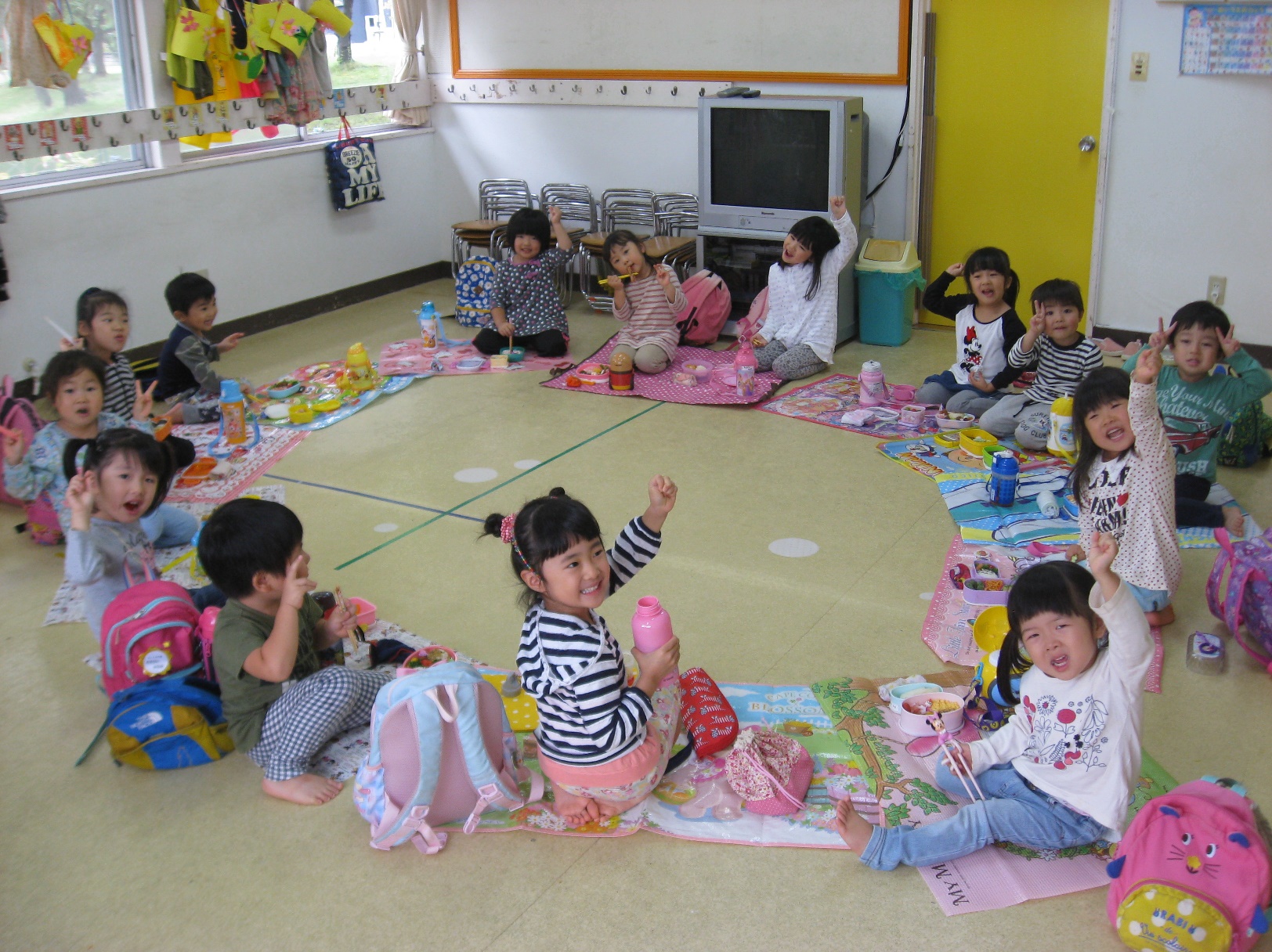 あいにくの雨模様のため、園外保育は延期となりましたが、以上児は遠足ごっこを、未満児はりんごもぎごっこをそれぞれお部屋で楽しんでいました。お昼は、お家の人に作ってもらったおいしいお弁当を食べ、ニコニコ笑顔がたくさん見られましたよ。