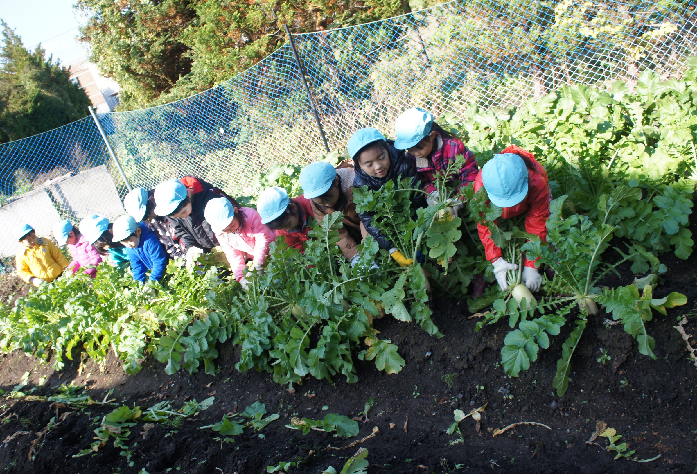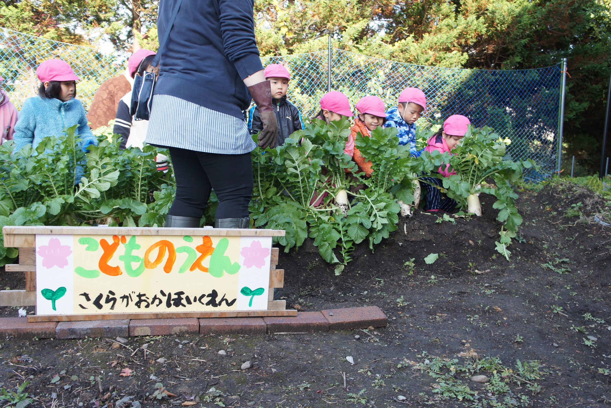 11月7日(月)年長すみれ組、年中さくら組が、佐藤長(大原店)近くの保育園駐車場奥にある「こどものうえん」の畑に、大根掘りに出かけてきました。園長先生に大根の抜き方を教えてもらい、張り切って大根を抜いていた子どもたち。大きな大根や小さな大根など、抜けると子どもたちから大きな歓声があがり、とても楽しそうでした。大小合わせておでん大根約120本、赤大根約42本を収穫し、年長児は2本、年中児は1本持ち帰り、おうちの方からも喜ばれました。保育園の給食でも収穫した大根をおいしく頂きたいと思います。