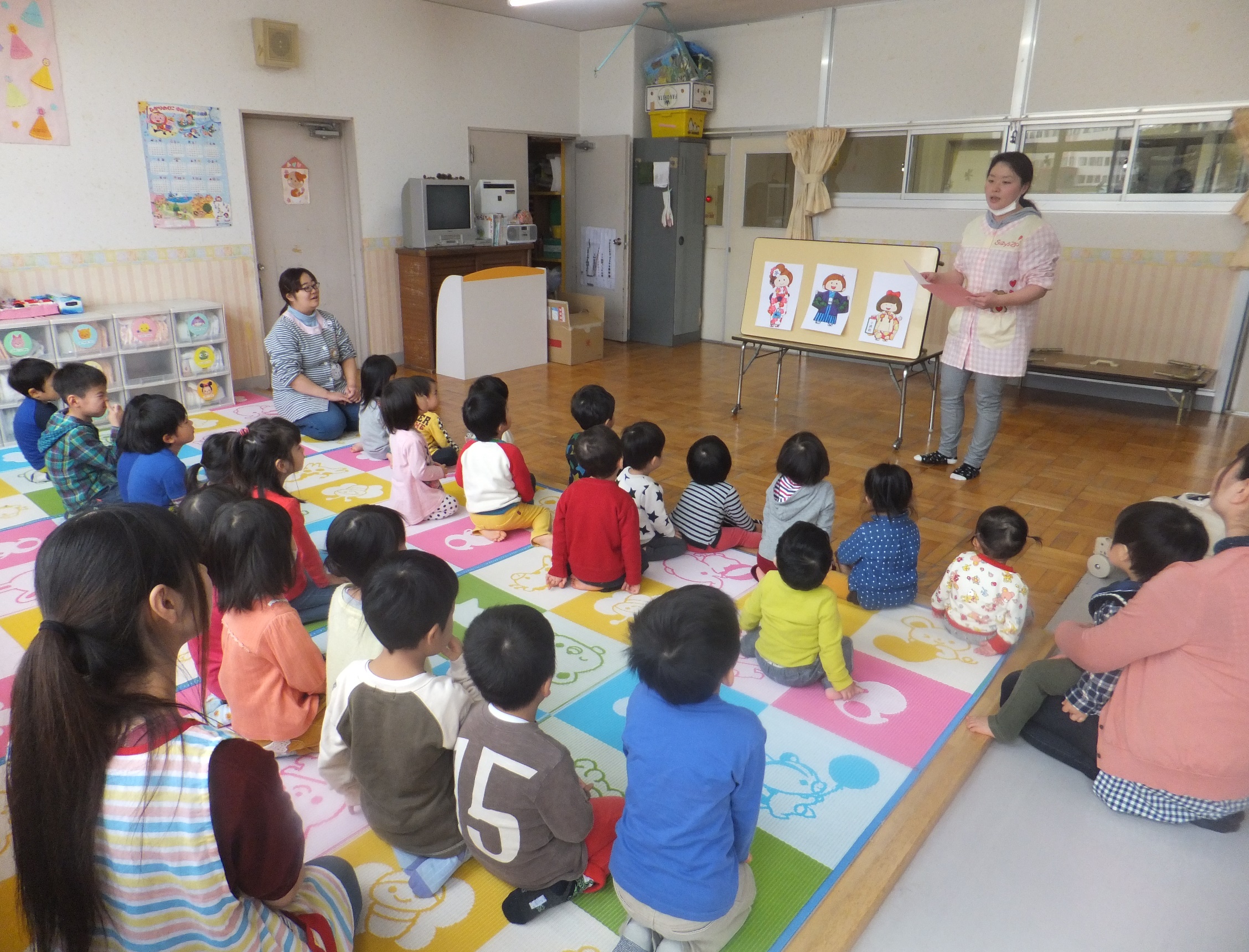 七五三の由来について興味津々に聞いていました。手巻きずしの製作をすると、ご飯に見立てたお花紙を丸めたり、楽しそうに製作していましたよ。完成した手巻きずしを持ち食べる真似をしたり、喜んでいました。