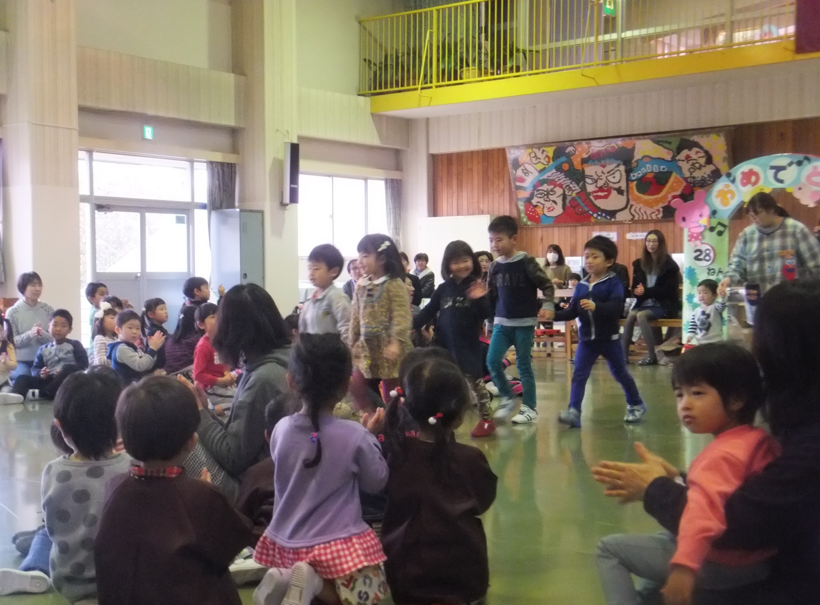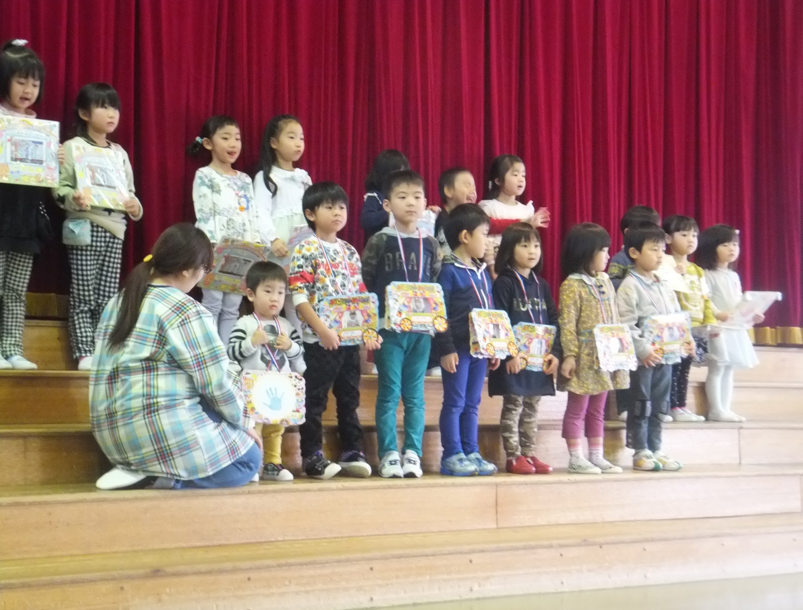 7人のお友達が、手をつないで嬉しそうに入場していました。インタビューでは、ハキハキと答え、とてもかっこよかったです。お楽しみの影絵では、すみれ組のお友達が参加し楽しんでいましたよ。