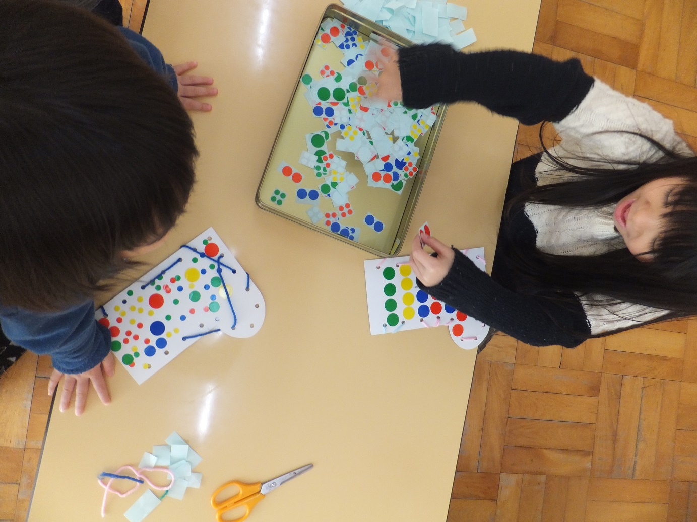クリスマスブーツの製作をしました。穴に毛糸を通したりシール貼りを集中して行っていましたよ。それぞれ個性が出ていてとても可愛く仕上がりました。