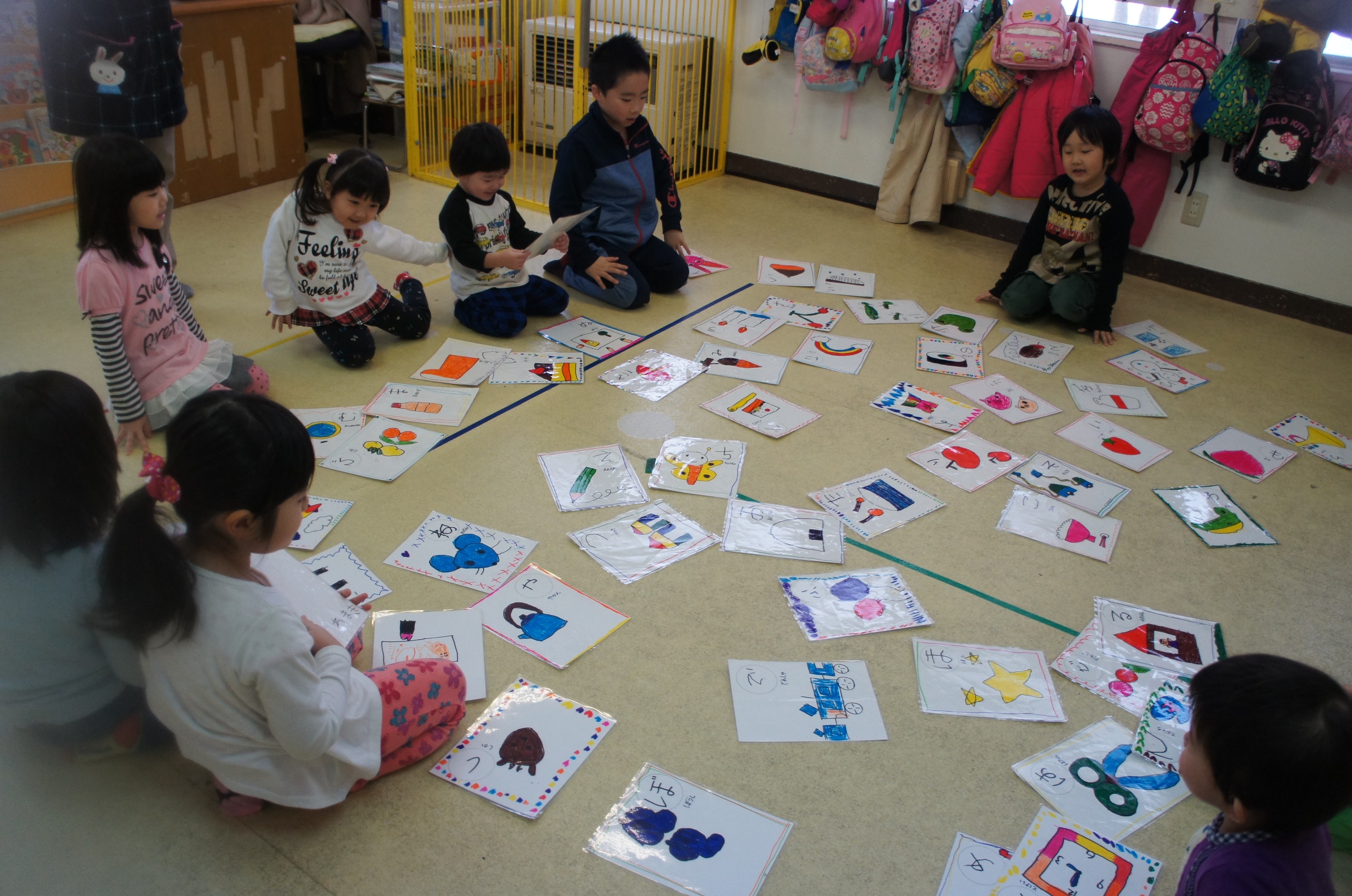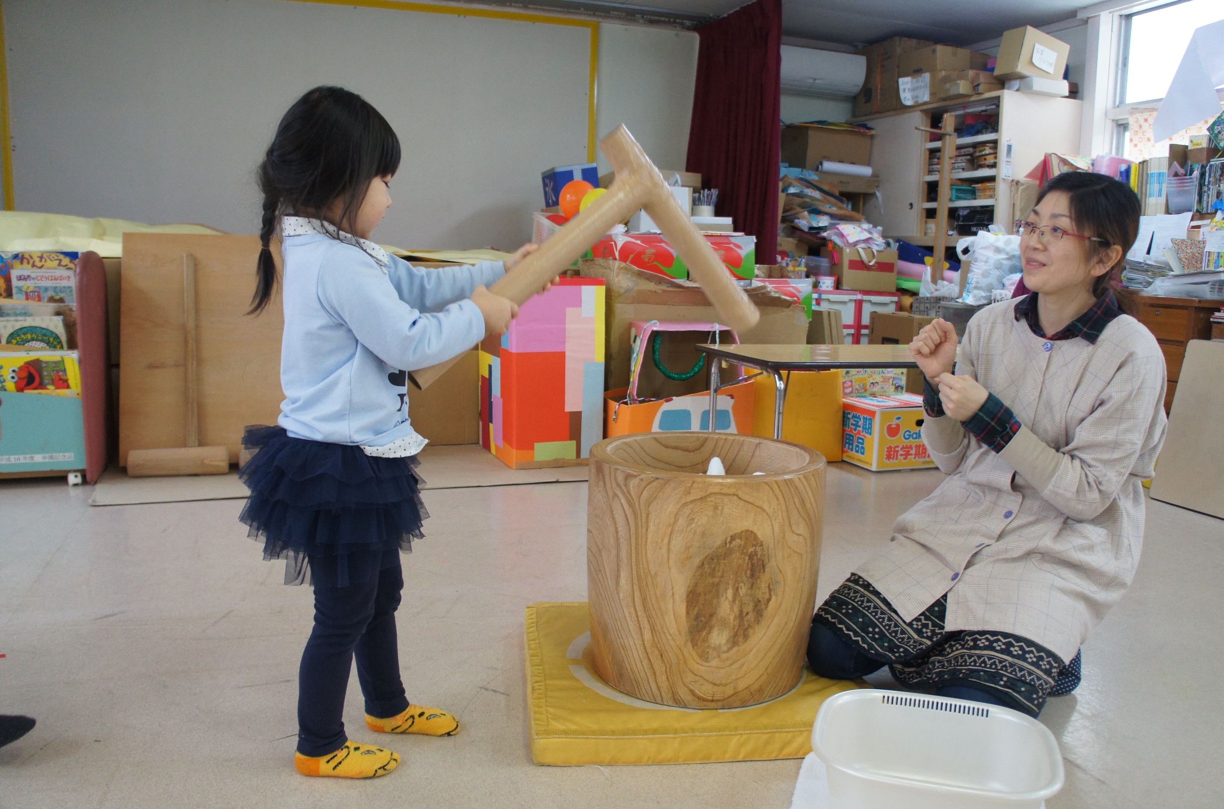 今年初めての自由保育がありました。ままごとコーナー、福笑い、カルタとりコーナー、こま製作コーナー、もちつきコーナーの4コーナーで遊び、子どもたちは思い思いのコーナーで楽しみました。中でももちつきコーナーは以上児、未満児さんどちらにも大人気で、もちつきの雰囲気を味わっていましたよ!
