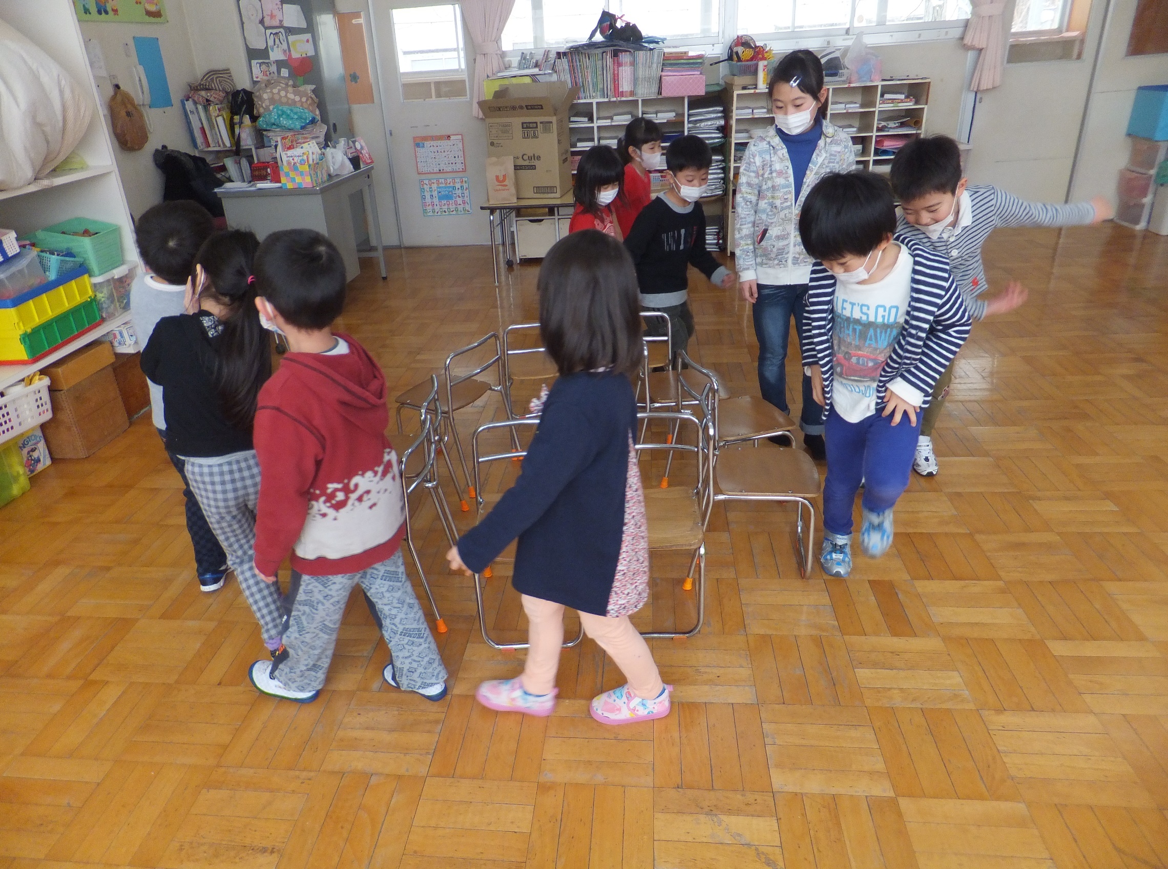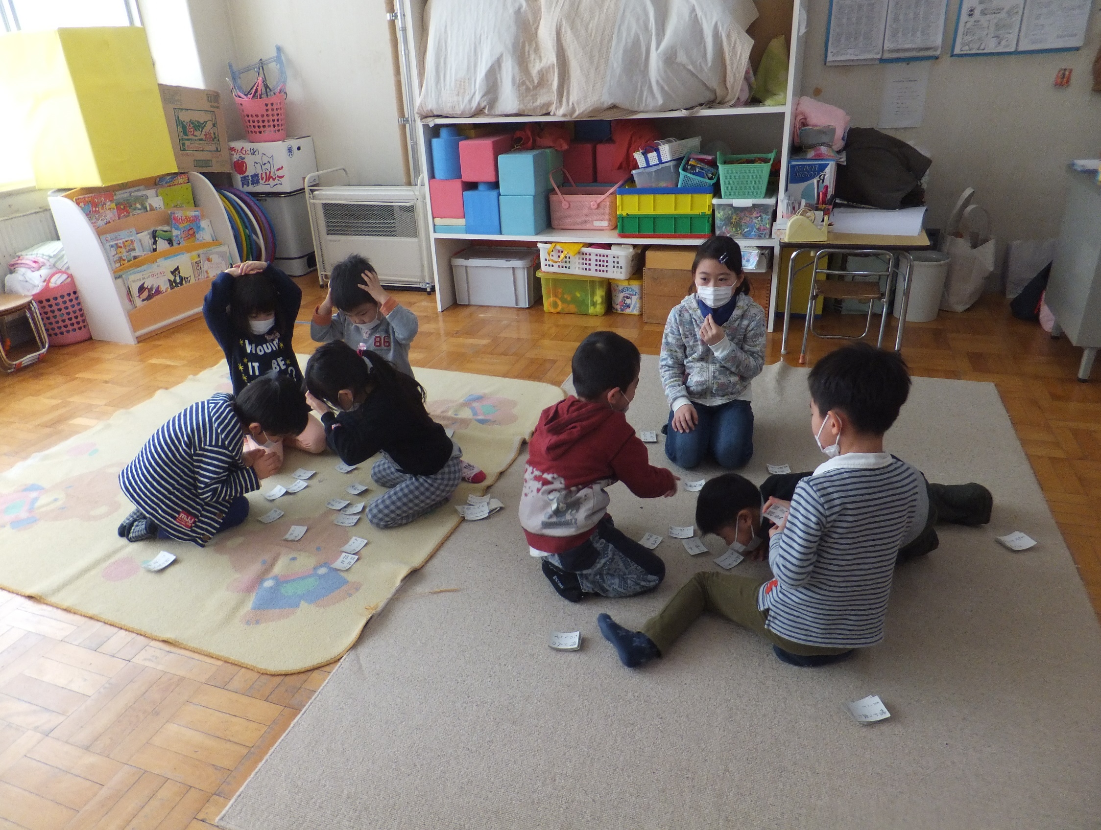 お部屋でカルタ取りを楽しみました。天気が悪かったので、雪遊びのかわりにいす取りゲームやみかん探しゲームを行ない、それぞれ元気に遊ぶ姿が見られました。