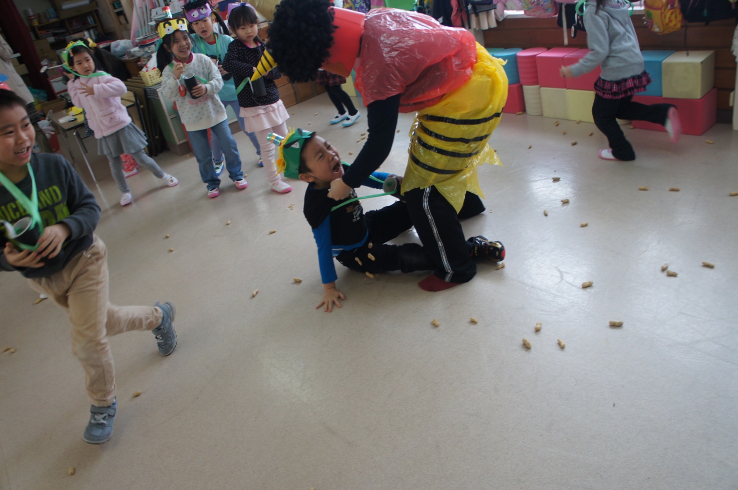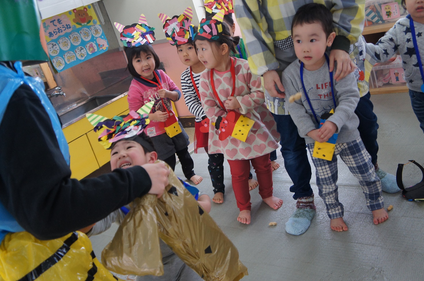 すみれ組保育室にて節分集会をしました。 節分の由来や各クラスのお面紹介があり、興味津々に見ていました。 鬼が登場すると号泣する子・頑張って豆を投げる子が多く見られていましたよ。