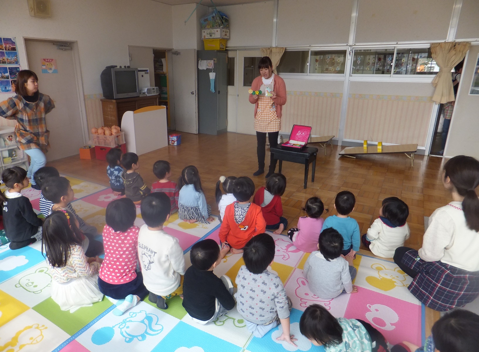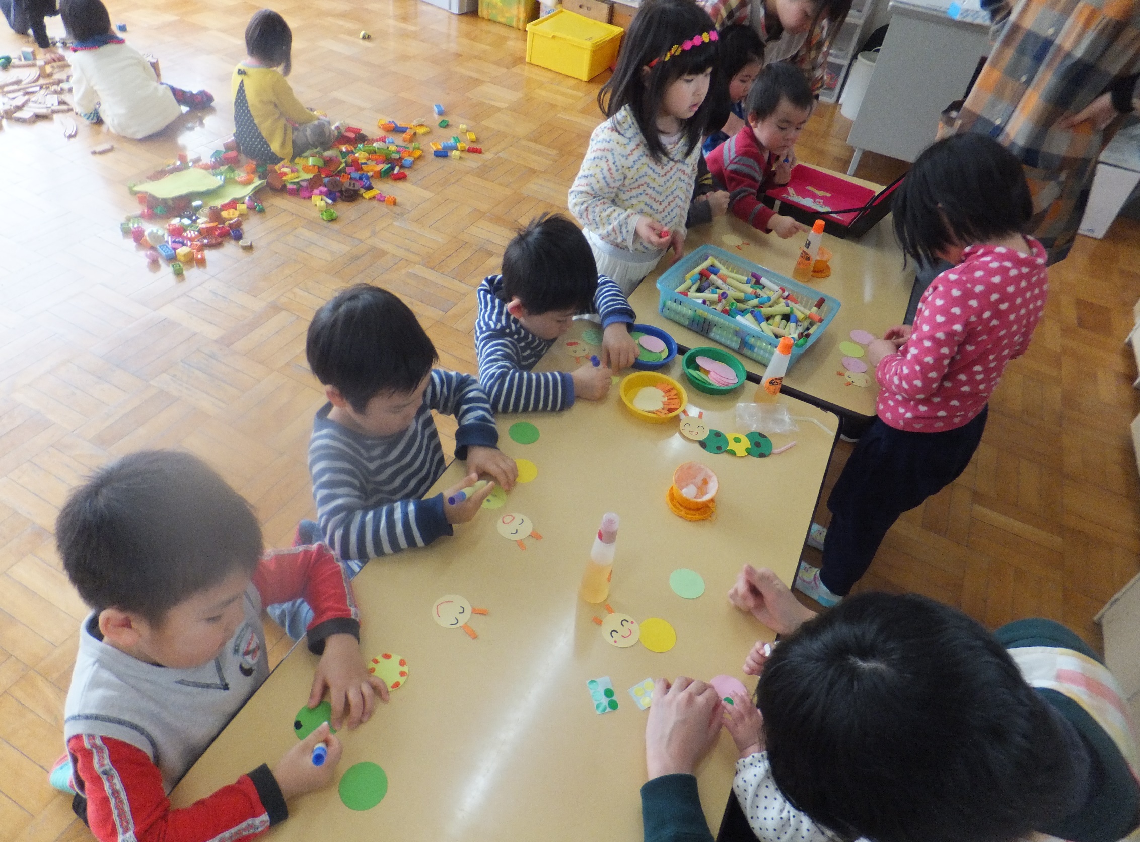 いもむし製作コーナーとミニカー、ままごとコーナーでした。いもむし製作コーナーでは顔を描いたりのりを使って体を繋げ、シールで模様をつけました。出来上がったいもむしを動かし友達と遊んでいましたよ。ミニカーコーナーでは、トンネルをくぐらせ、繰り返し楽しんでいました。