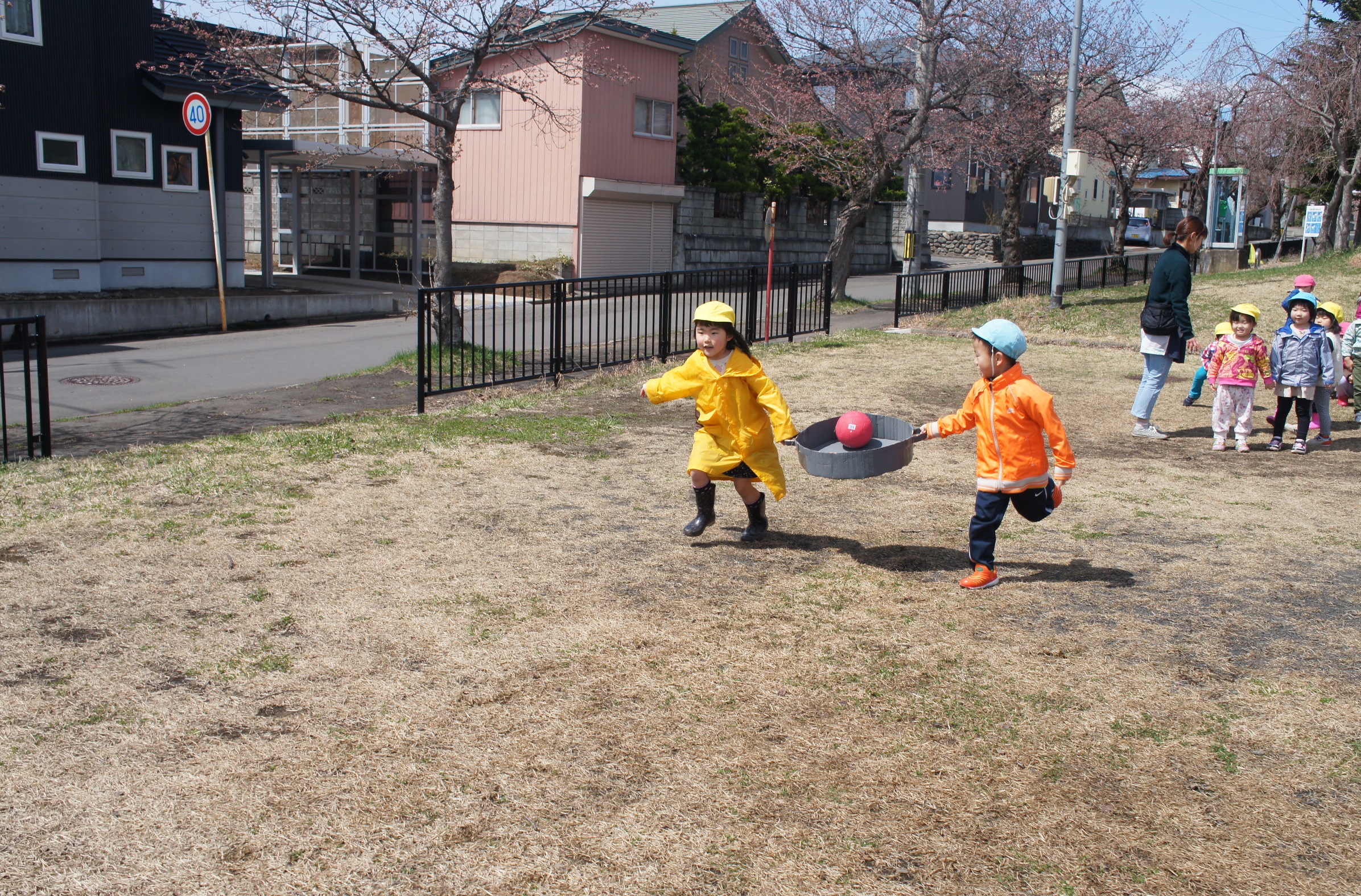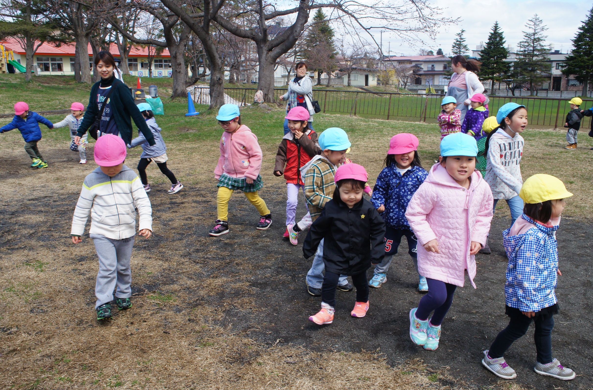 今年度初めての運動遊びがありました。中央公園に集合した、本園と分園の以上児のお友達。みんなで一緒にダンスをしたり、チームで協力してボール運び競争をしたり・・・大盛り上がりのひとときでした。
