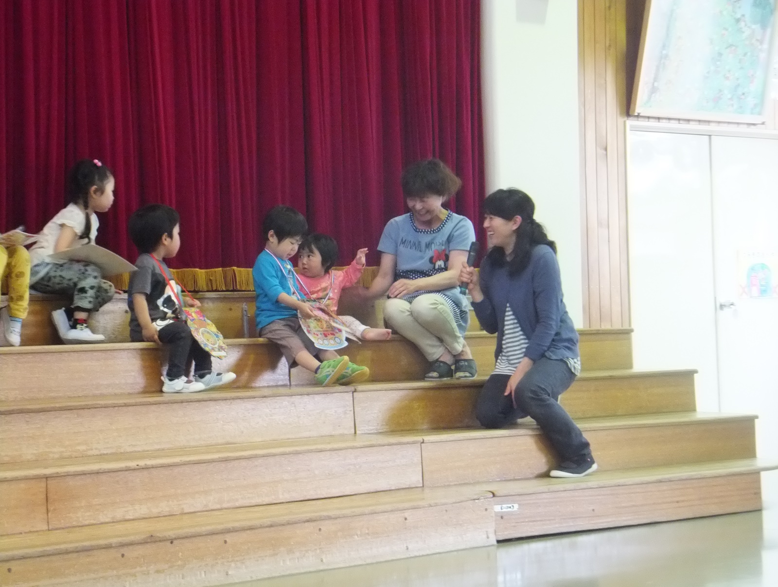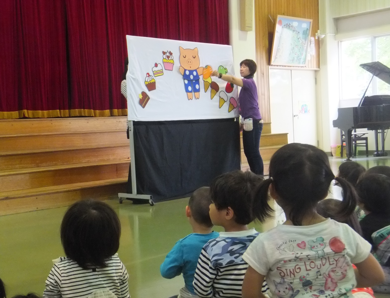 5月生まれの誕生会があり、保育園からは2人のお友達が出ましたよ。保育者と一緒にお返事をしたり、インタビューにドキドキしながらも頑張って答えていました。お楽しみのパネルシアターも喜んで見ていました。
