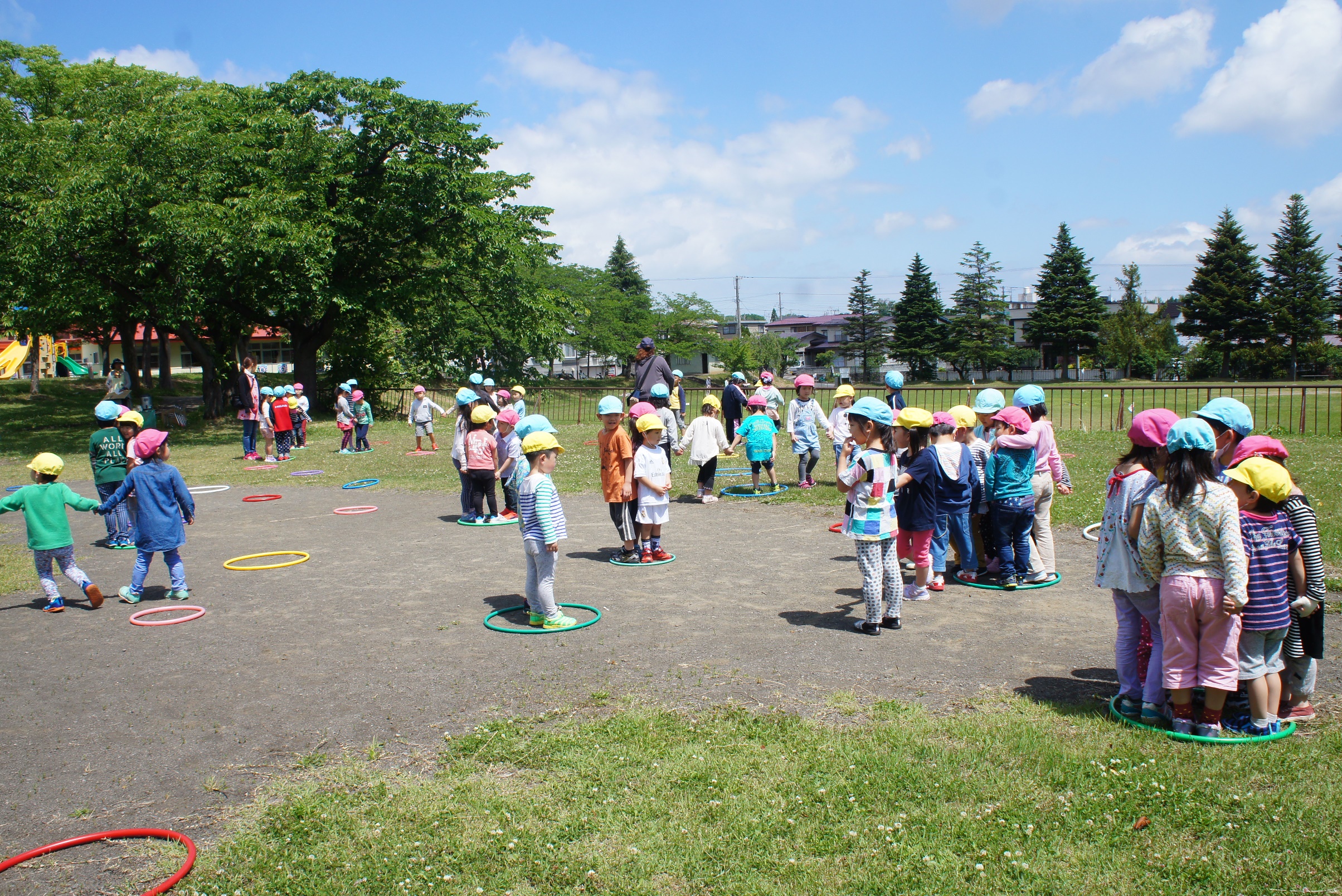 中央公園にて以上児運動遊びを行ないました。今回は、お引越しゲームと、王様に王冠を届けよう!ゲームの2つを楽しみ、子ども達は公園を思いっきり走り回り、とっても楽しそうでしたよ。