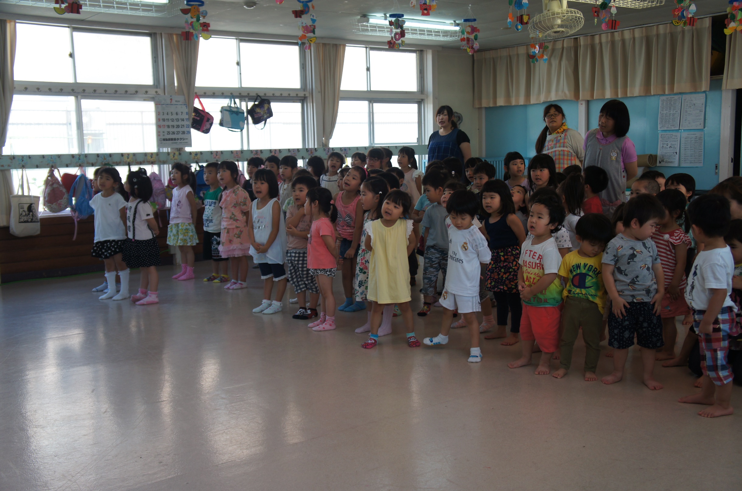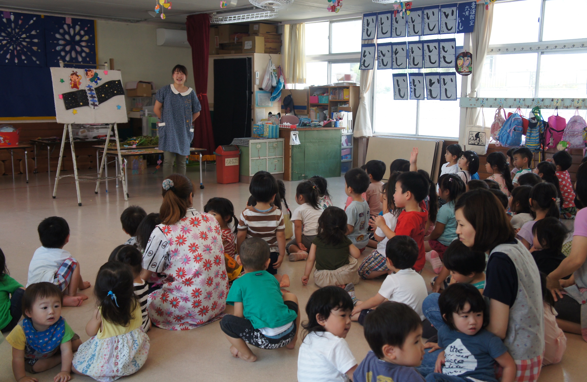 すみれ組保育室にて、七夕集会がありました。七夕飾りの由来を聞いたり、各クラスの七夕飾りを見るなどして、子ども達は七夕への興味をより一層深めているようでした。