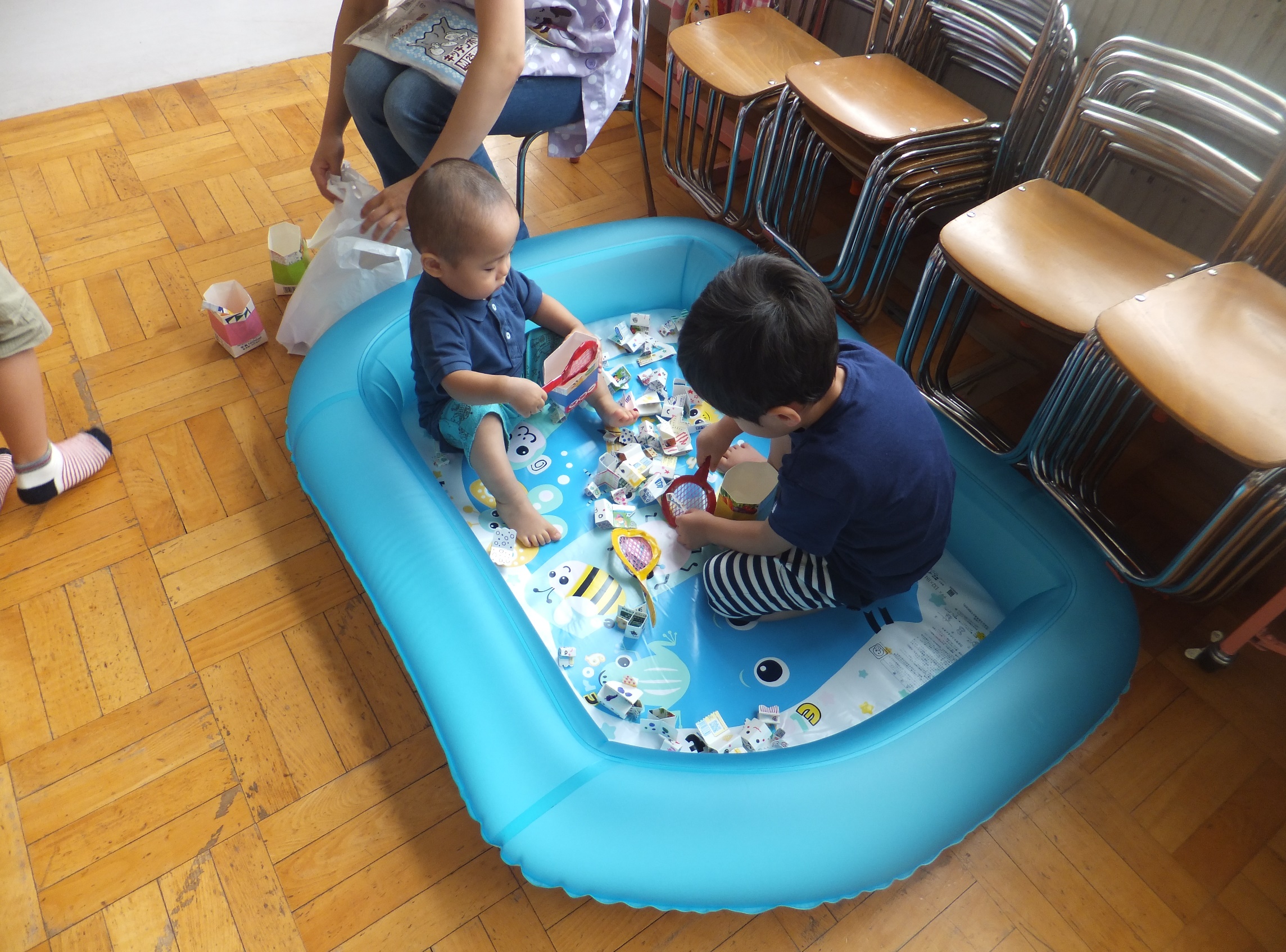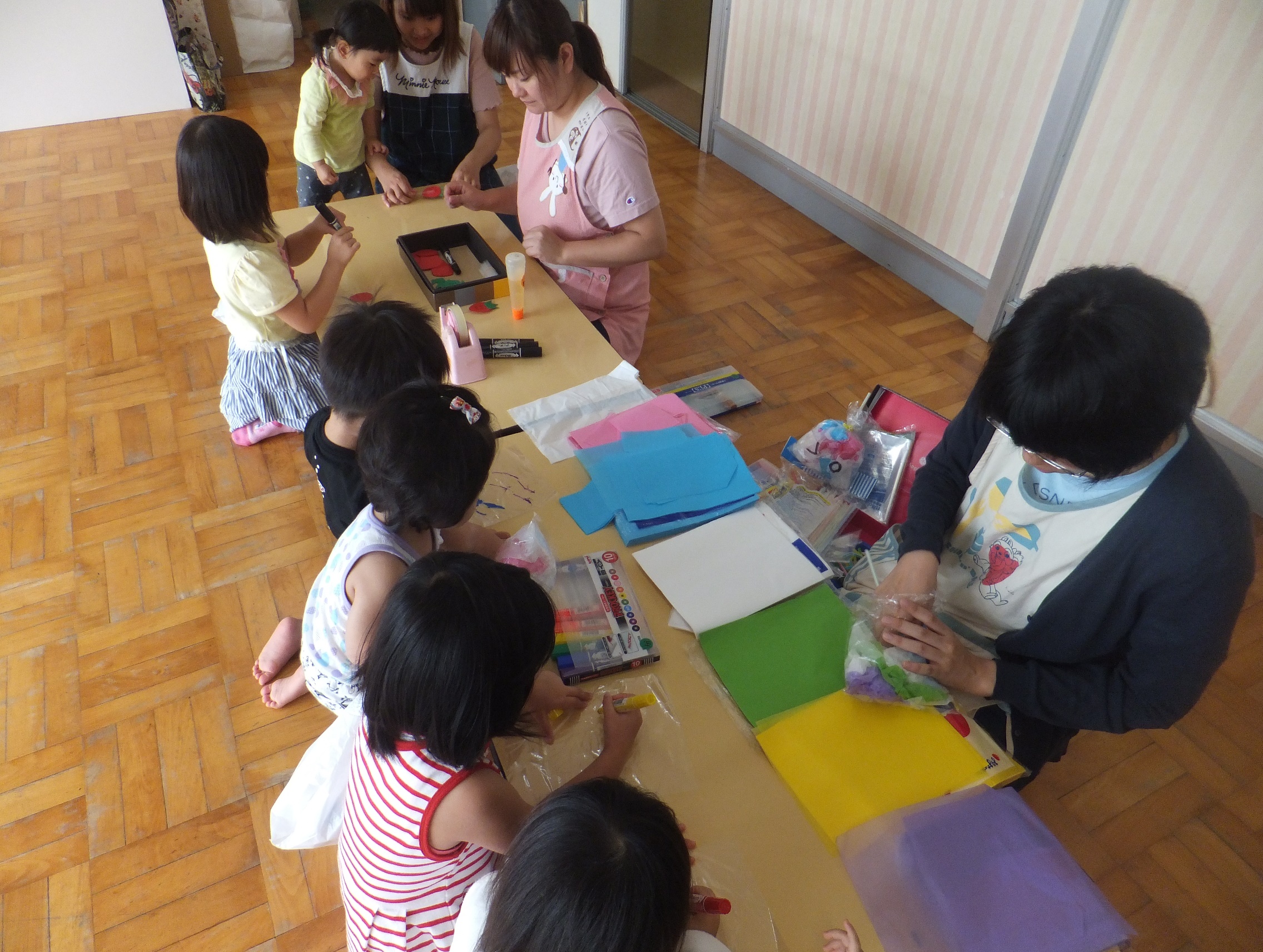 お祭りごっこをしました。わたあめ、いちごあめの製作コーナーと輪投げ、たこの千本引き、金魚すくいコーナーがあり、大喜びでコーナーをめぐっていましたよ。製作した物や千本引きの景品を」「これあたったんだよ!」「わたあめ、かわいくできた」と嬉しそうに見せてくれていました。