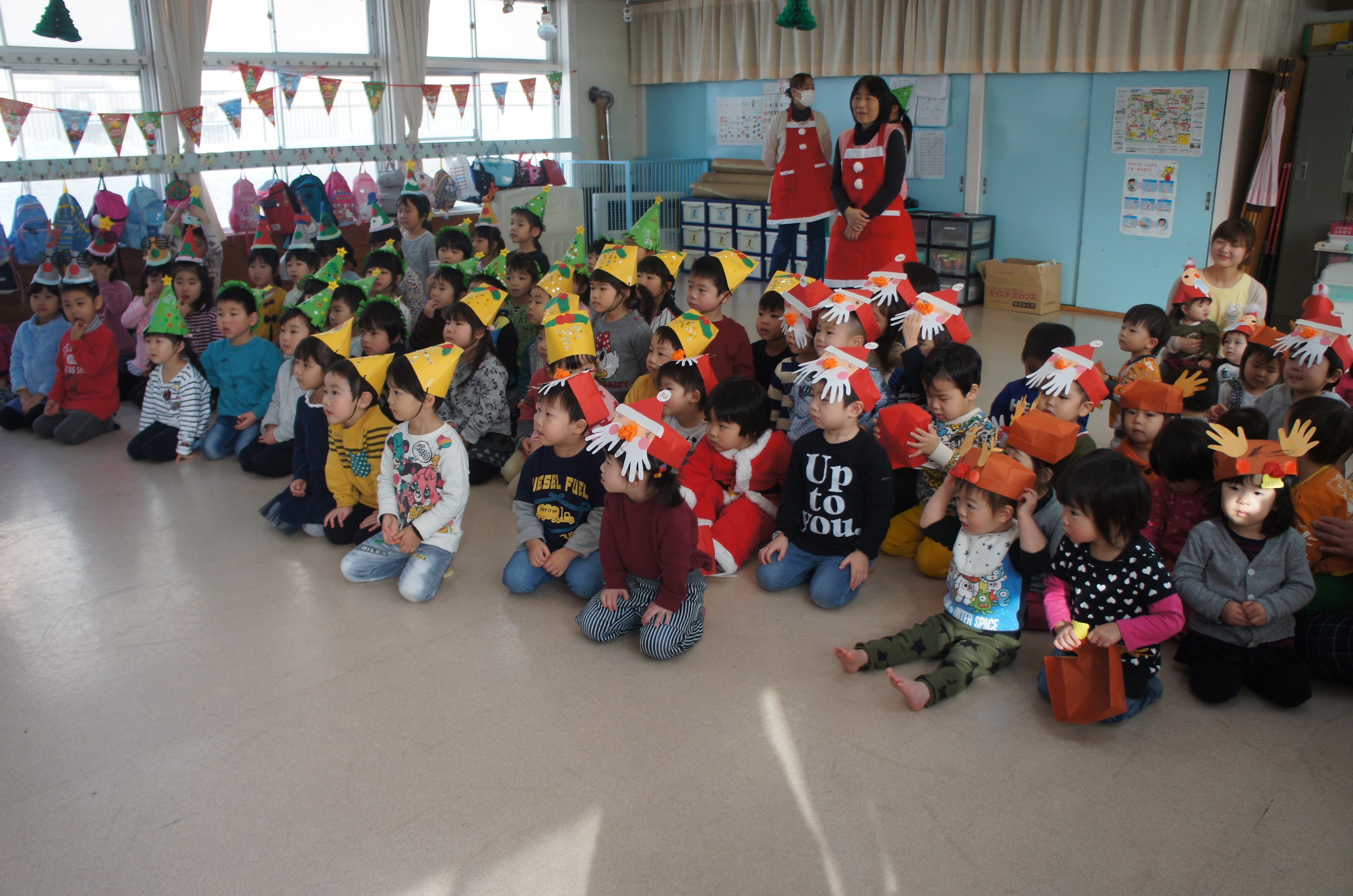 子ども達が楽しみにしていたクリスマス会。自分たちで作った帽子を被って参加しました。サンタクロースの劇を真剣な表情で見ていました。最後には、サンタさんと、トナカイさんが登場し、みんなに素敵なプレゼントを持ってきてくれました。