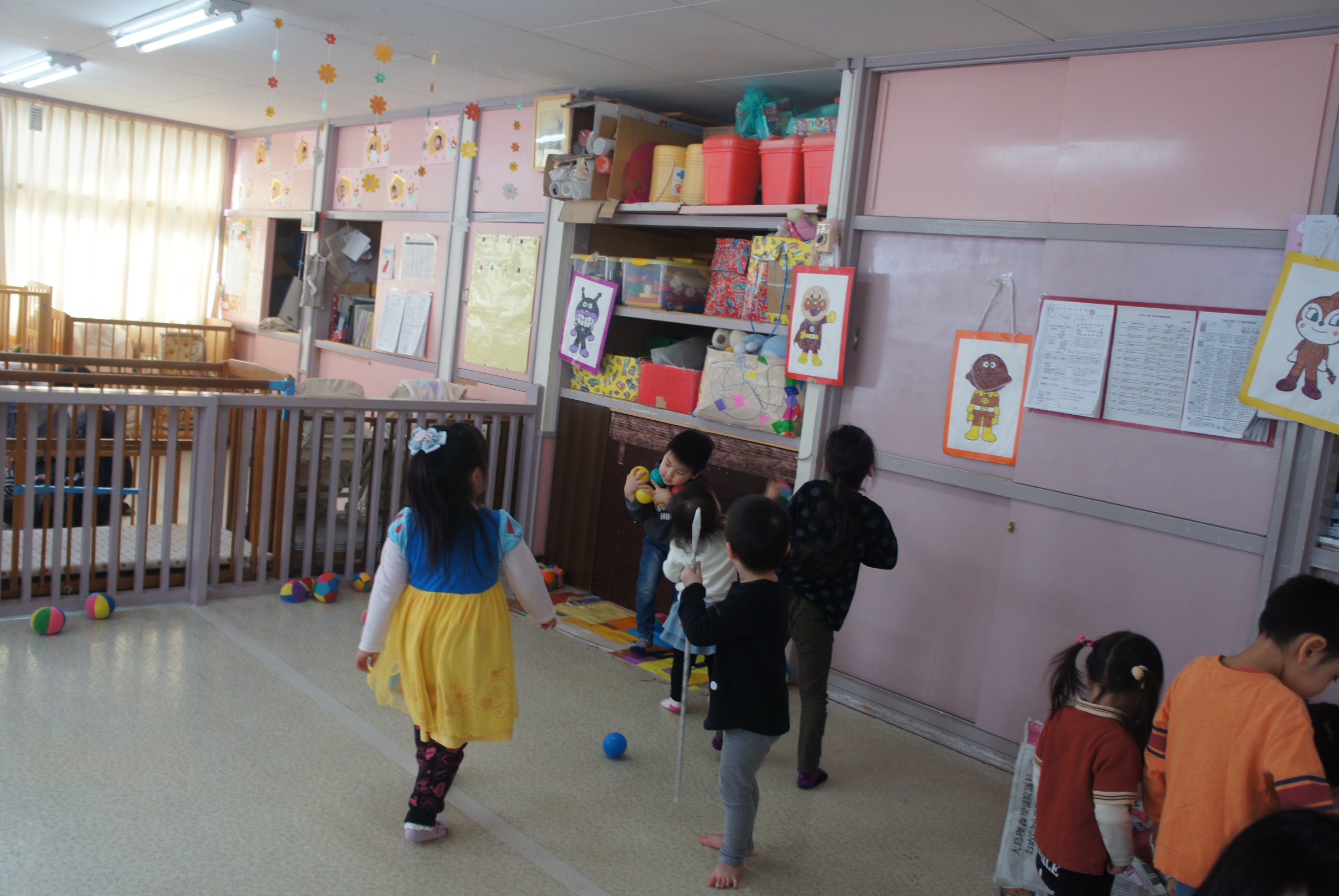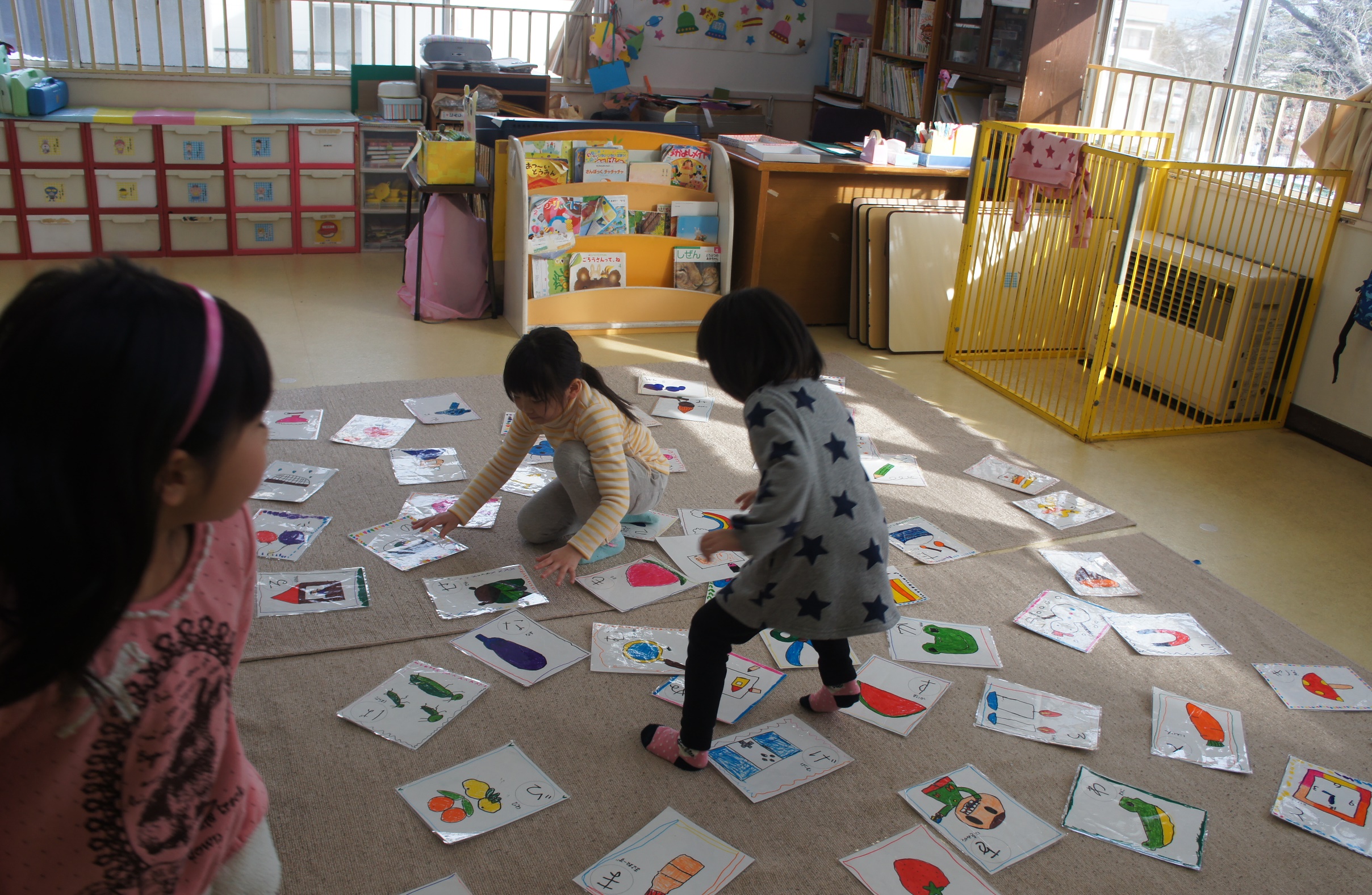 子ども達が楽しみにしている自由保育。今回はお正月らしく、新聞紙と的あてコーナー、カルタとりコーナー、こま回しコーナー、羽根つきコーナーが用意され、子ども達は思い思いのコーナーでお正月の雰囲気を楽しんでいましたよ。