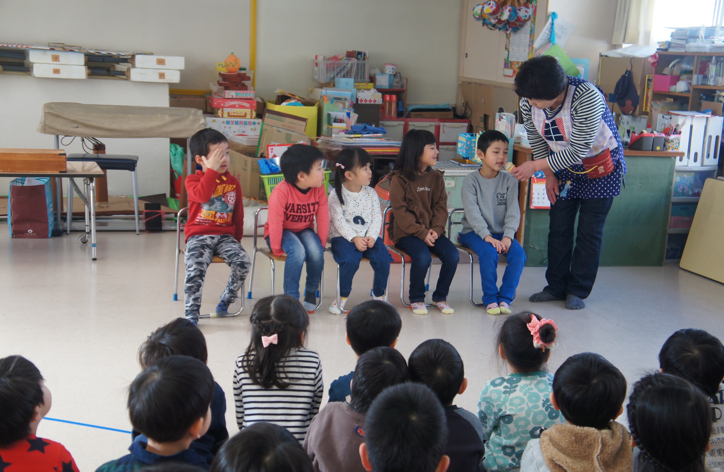 すみれ組保育室にて、1月生まれの誕生会がありました。この日を楽しみに待っていた1月生まれのお友達。緊張した面持ちをしていたものの、お返事やインタビューにしっかりと答えていました。おたのしみでは「海賊の銀の宝物」のシアターを集中して見ていましたよ。