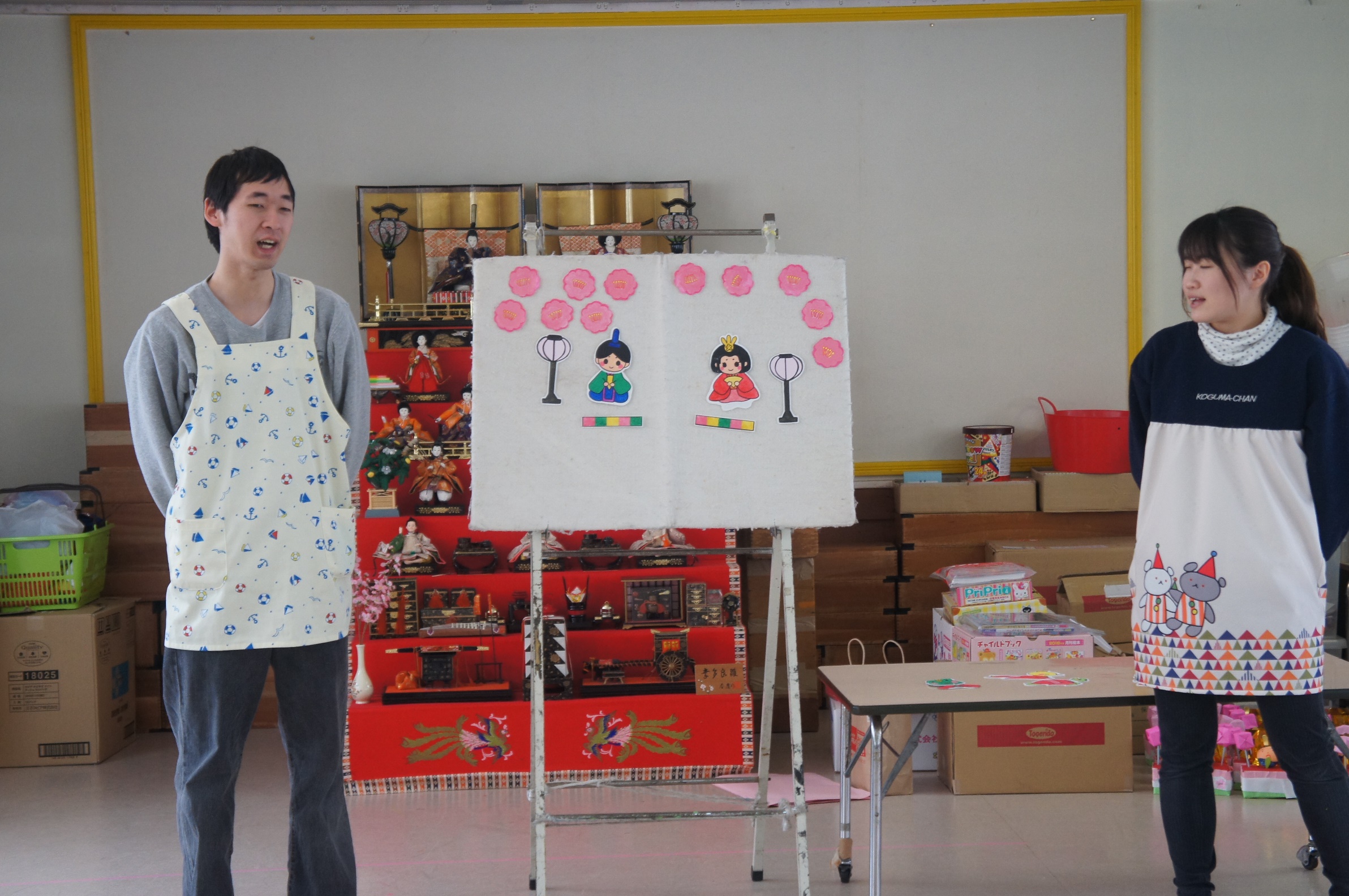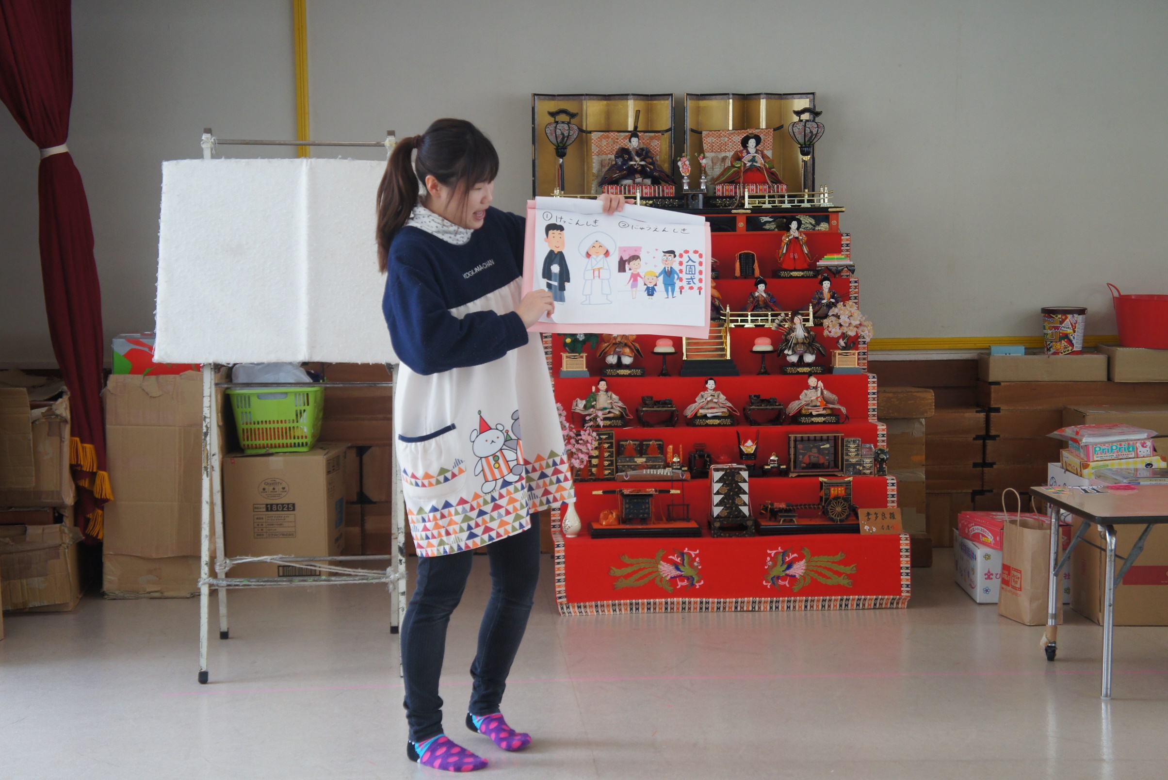 すみれ組保育室にて、桃の節句集会がありました。集まった子どもたちはひな祭りの由来や行事食のクイズを見たり、おたのしみのパネルシアター「おひなさまはだあれ」を見たりして、楽しそうに参加していましたよ。