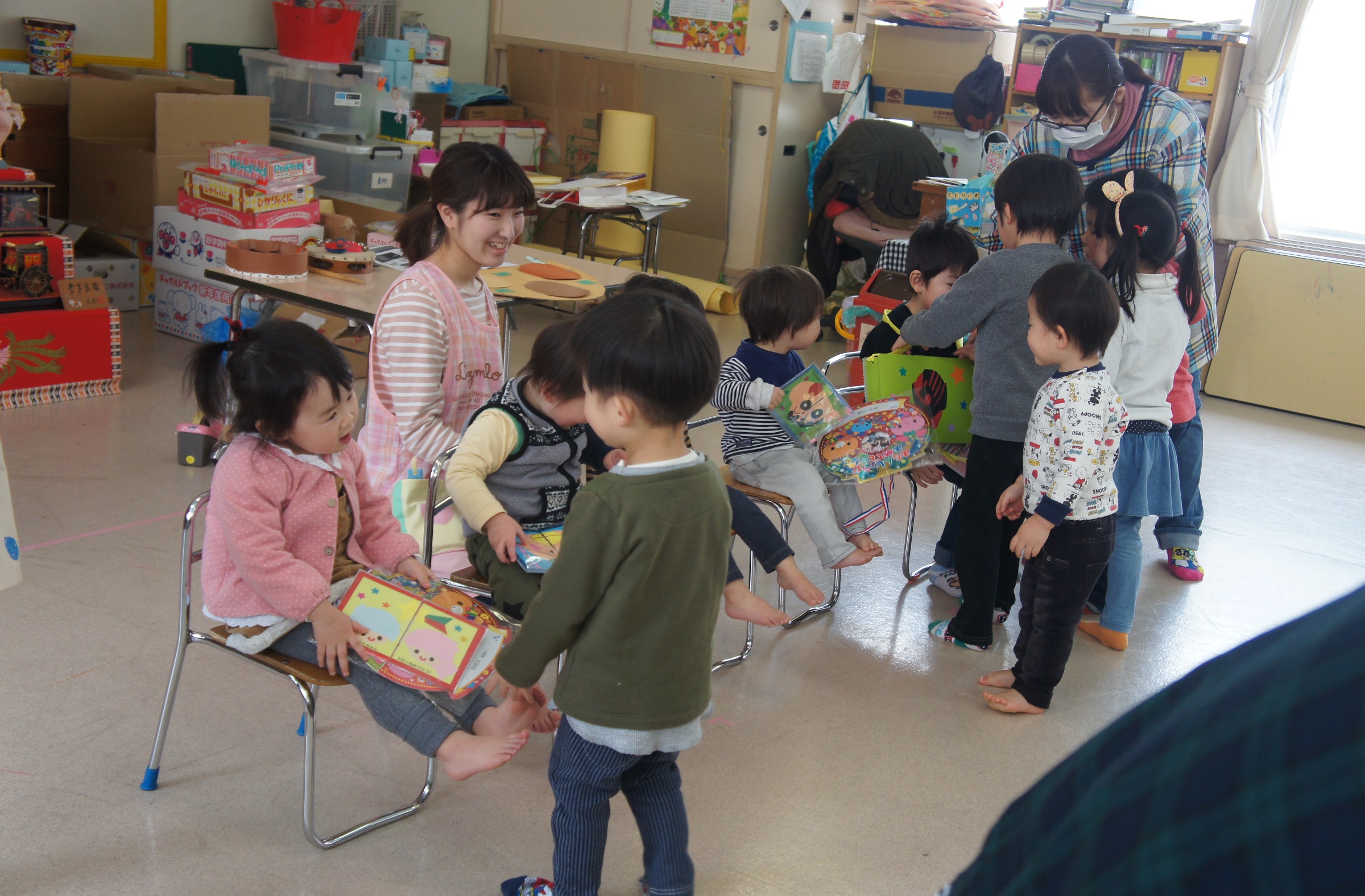 3月生まれの誕生会がありました。3月生まれの5人のお友達は、立派にお返事やインタビューに答え、お友達からのプレゼントに笑顔を見せていましたよ。おたのしみでは、ミニシアター「おきておきて!」を楽しそうに見ていました。