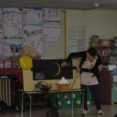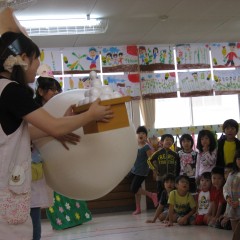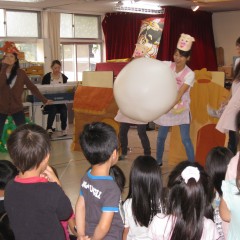 十五夜の由来について聞いた後、職員による劇「3匹のこぶたのお月見」を見ました。