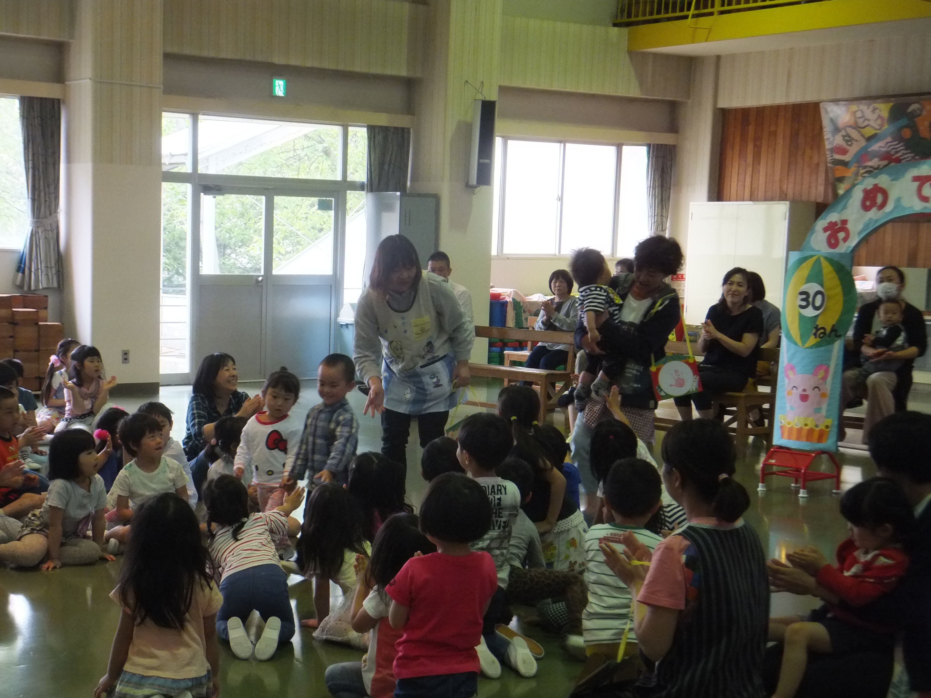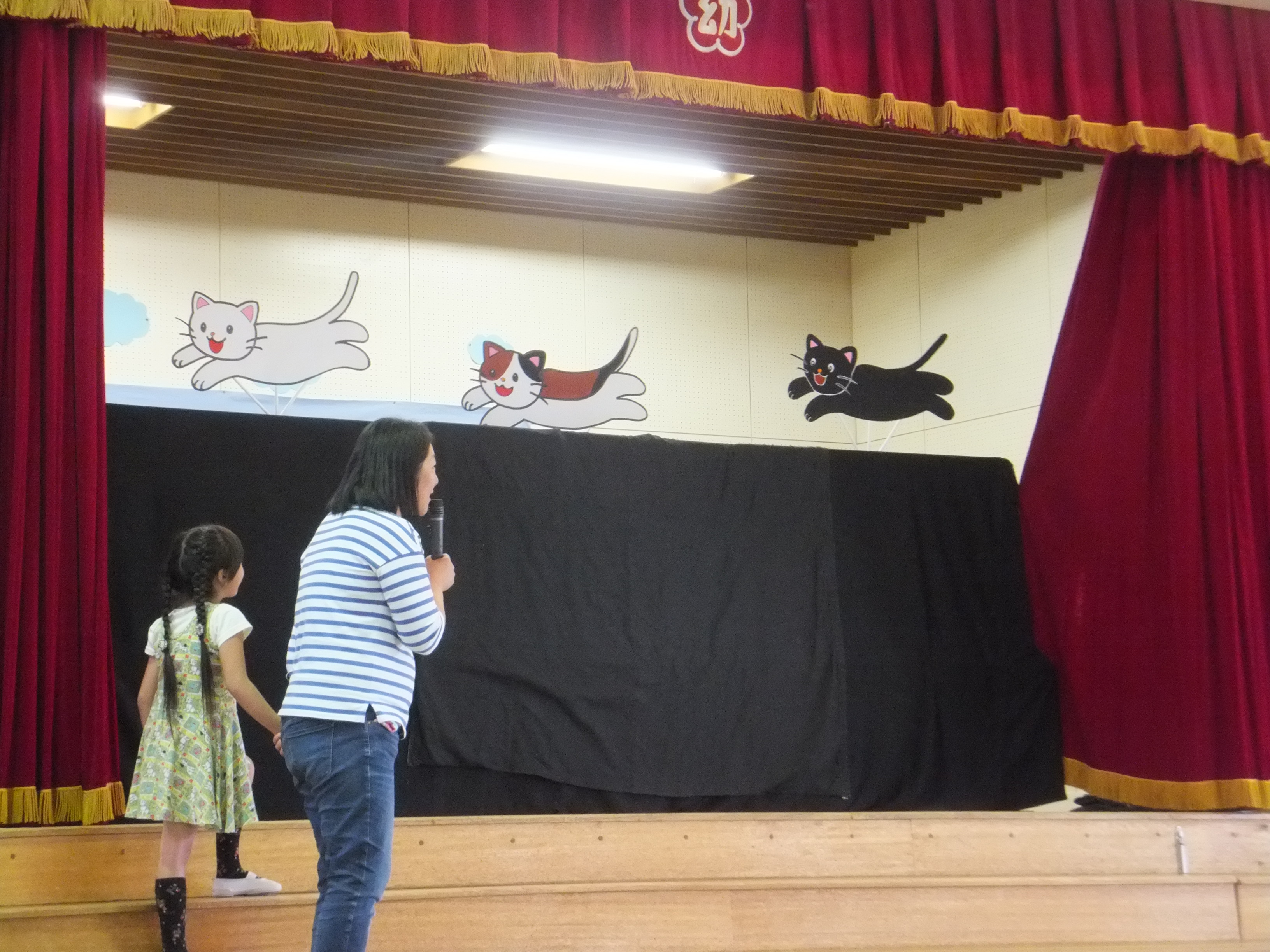 今日は5月生まれのお友だちの誕生会がありました。 保育園からは、4月の誕生会に参加できなかったお友だちも含めて、3人のお友だちが参加しました。名前を呼ばれると返事をしたり、好きな食べ物を答えたりとても上手に舞台上に立っていましたよ!お楽しみの「3匹の猫」のペープサートも喜んで見ていました。