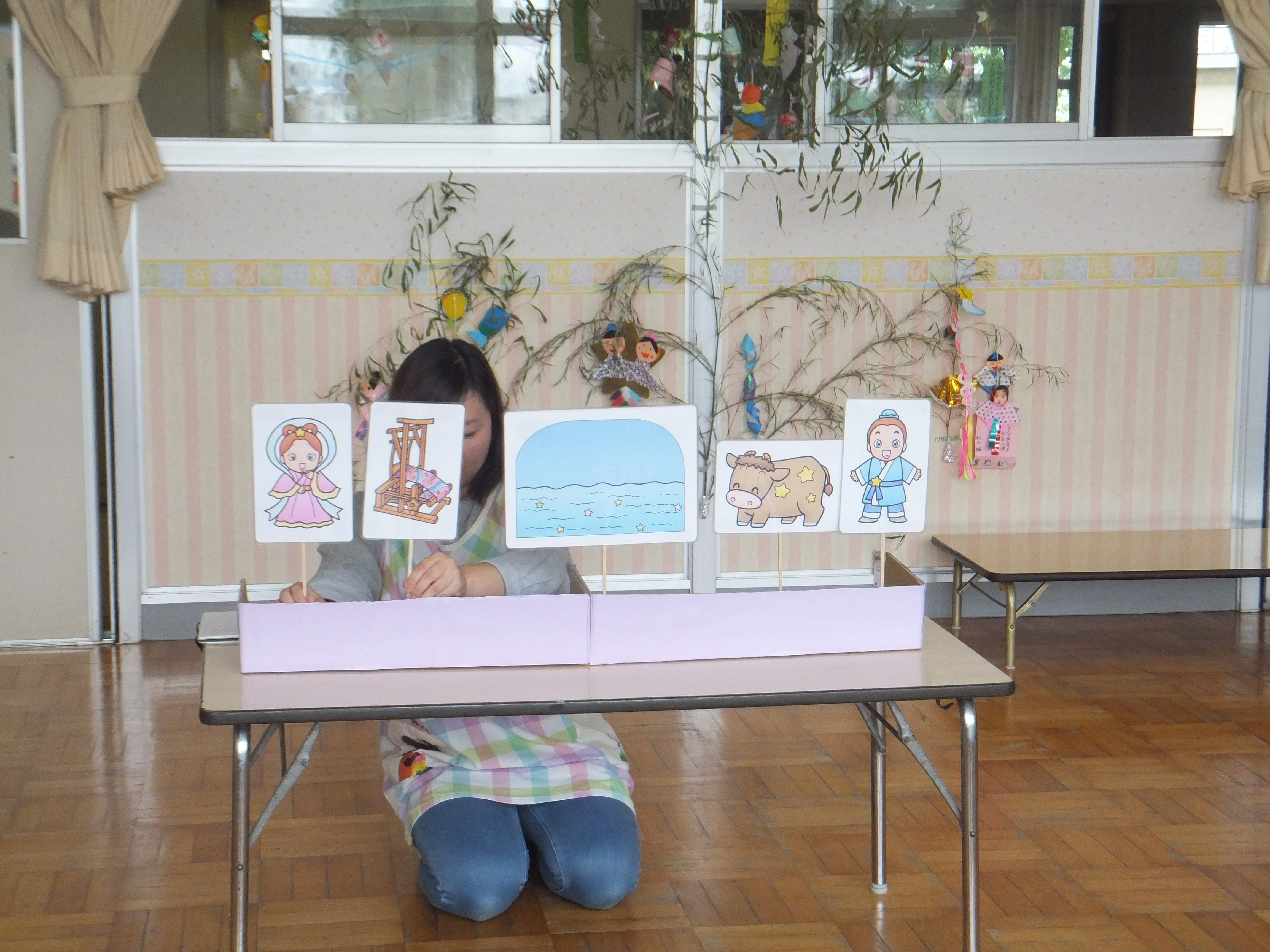 外は生憎の雨でしたが、天まで届くような子どもたちの七夕の歌で集会が始まりました。集会では、各クラスの笹飾りを見せ合い、代表のお友だちがどのようにして作ったか、インタビューに答えてくれました。また、七夕の由来についてのペープサートをじーっと見入っていました。最後に、笹飾りの前で記念撮影をして終了となりましたが、子どもたちの願い事が叶いますように。