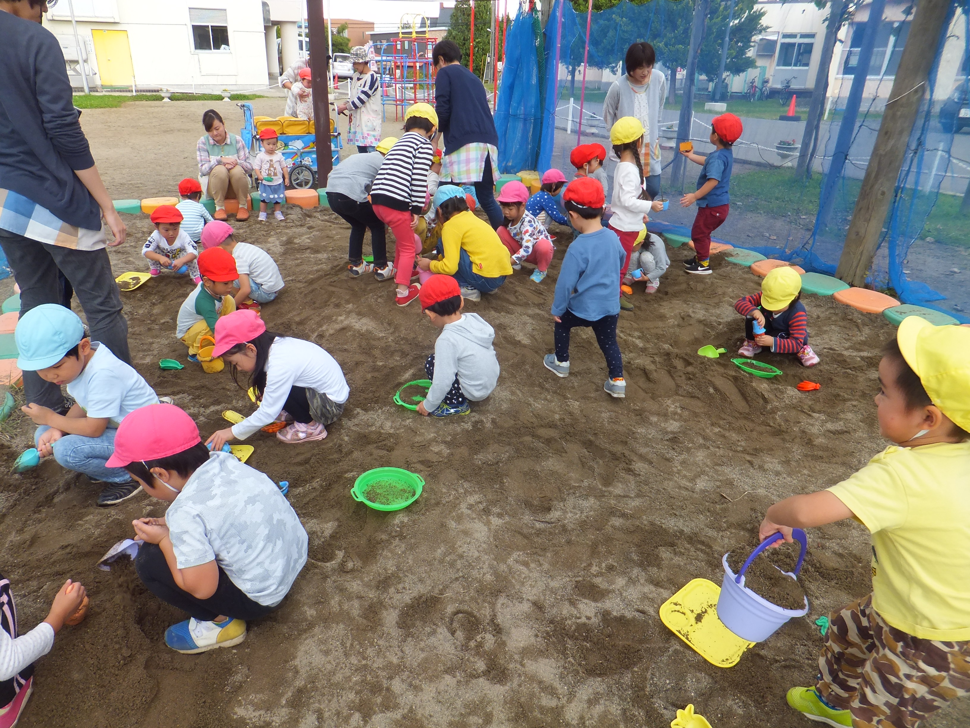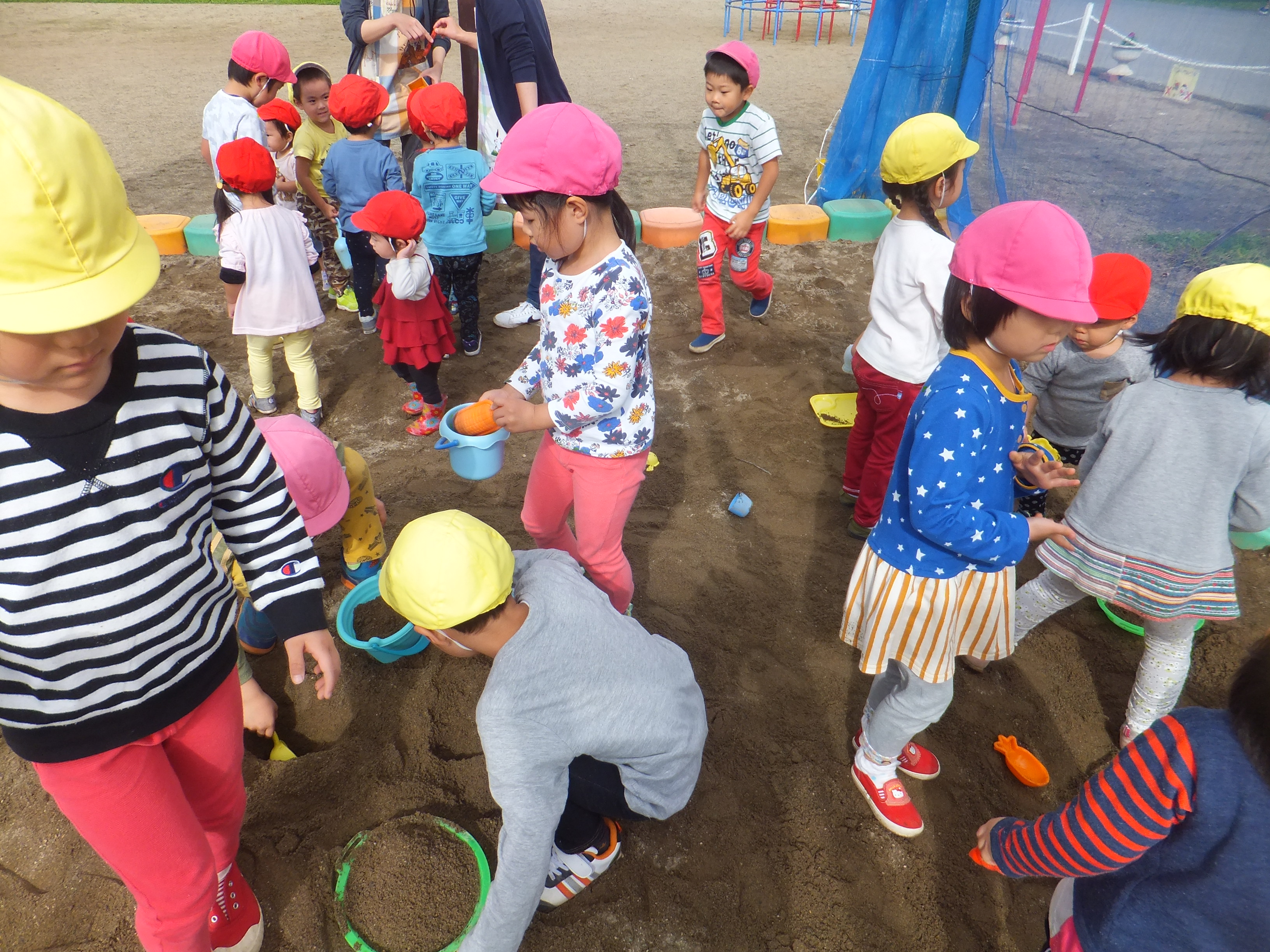今日は自由保育で砂遊びをしました。スコップやバケツを使って大きな山を作ってみたり、穴を掘ったりして自由に遊んでいました。型抜きでは大きいお友達が小さいお友達と一緒に作ってあげたり、ソフトクリームの型抜きが完成すると「はいどうぞ!」とお友達に渡していましたよ!