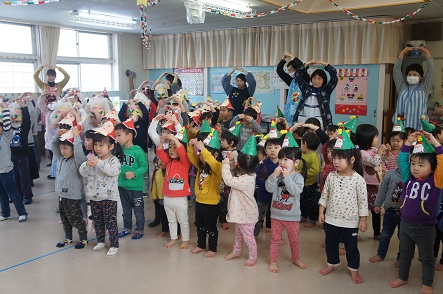 各クラス自分たちで作った帽子を被り始まったクリスマス会。