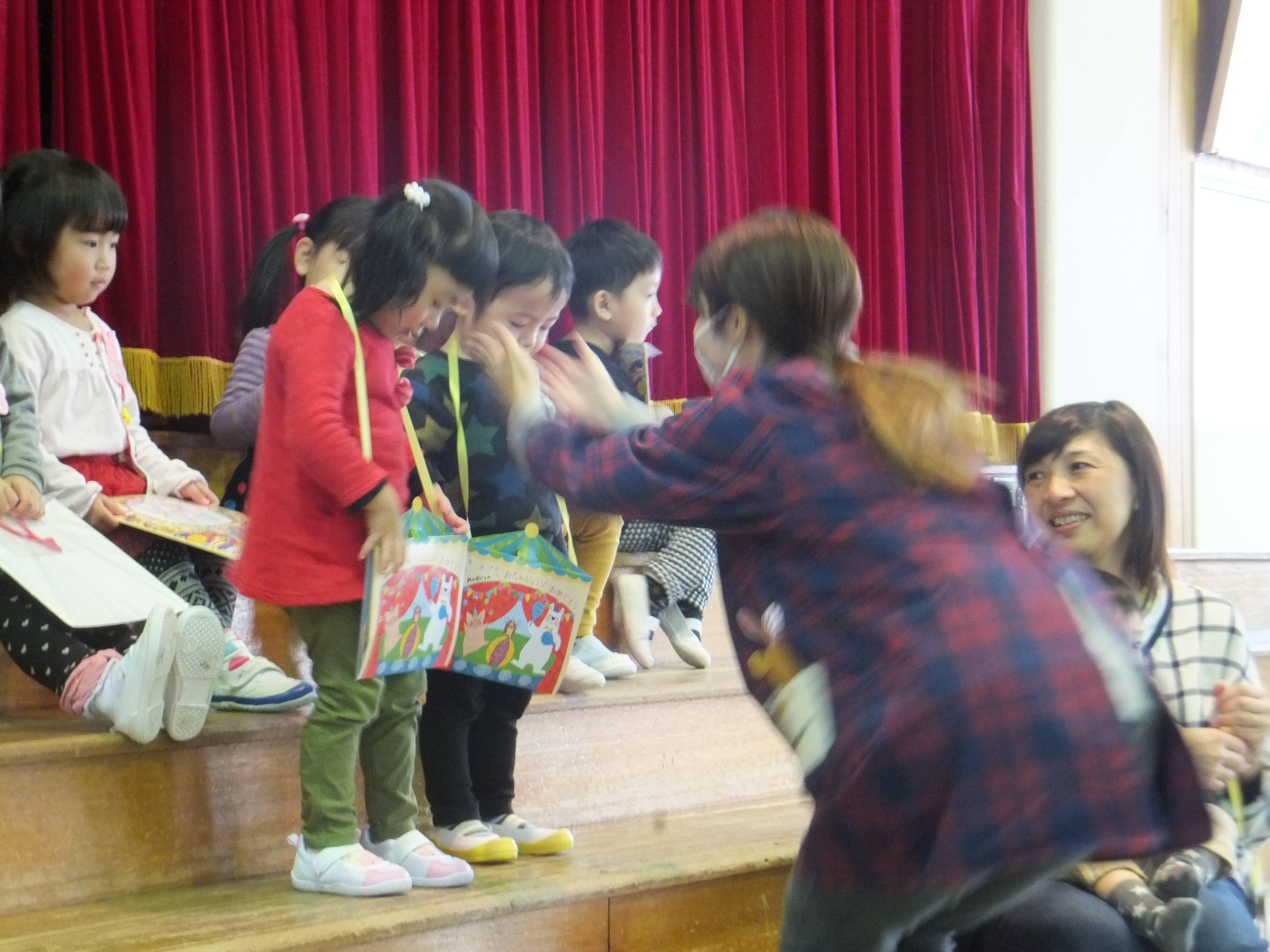 今日は、12月生まれのお友だちの誕生会がありました。ちゅうりっぷ組さん2名と、先月の誕生会を欠席したつくし組さん1名が参加しました。ちゅうりっぷさんはお名前を呼ばれると、元気にお返事することができました。お楽しみでは大型絵本「タコめし」を見て、おいしそうなお弁当の絵に釘付けでした。