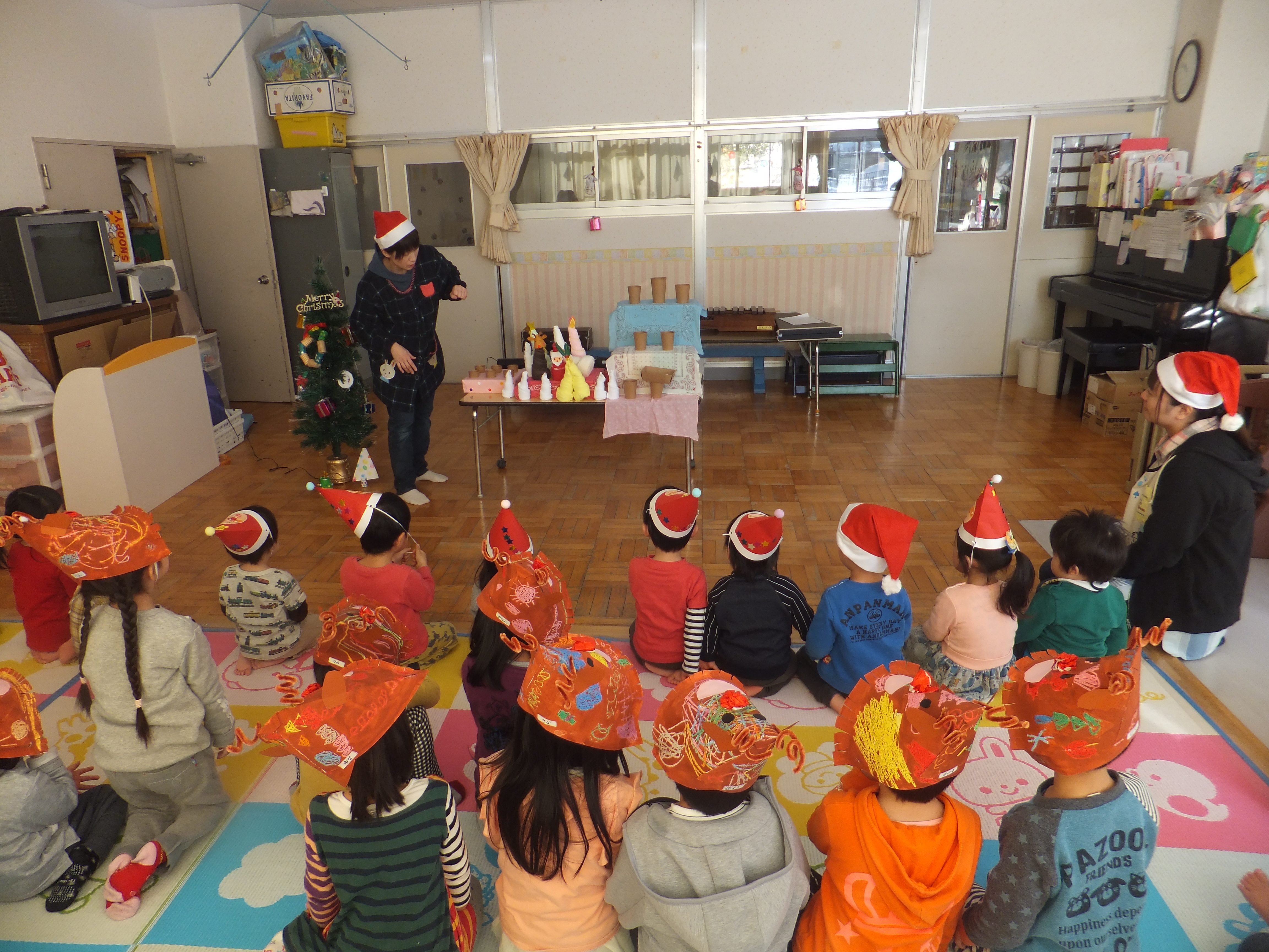 製作した帽子をかぶり、クリスマス会をしました。「あわてんぼうのサンタクロース」を歌ったり、「サンタトナカイ」を踊ったりして、お楽しみのシアター「ソフトクリームのクリスマス」も嬉しそうに見ていましたよ。各クラスで製作したオーナメントやツリーの紹介では、シールを貼ったことや模様を描いたこと、ハサミで切ったことなどをドキドキしながら答えてくれました。最後は、先生たちから合奏のプレゼントがあり、子ども達は初めて見る楽器に興味津々で、目を輝かせながら聞いていましたよ。