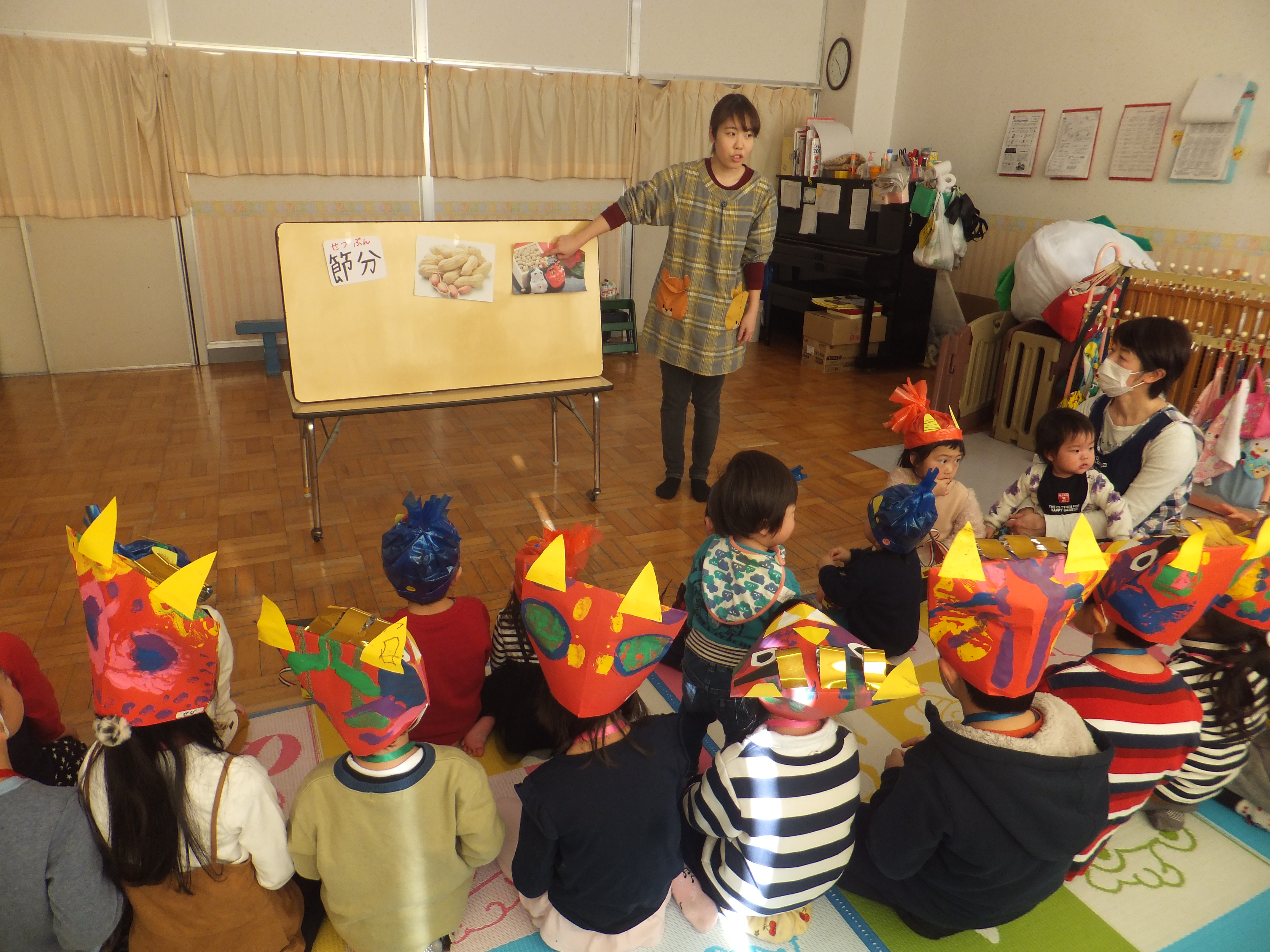 朝から「鬼来る?」「鬼、怖くないよ!」と子ども達はドキドキ、わくわくしている様子でした。 集会では、節分の由来を聞いたり、各クラスの鬼の帽子と豆入れの紹介をしたりしました。お楽しみのビリビリシアターも楽しそうに参加していましたよ。 鬼が登場すると「キャー!!」と逃げながらも頑張って豆まきをしていました。泣いてしまった子もいましたが、最後は鬼と仲良しになり一緒に記念撮影をすることができましたよ。
