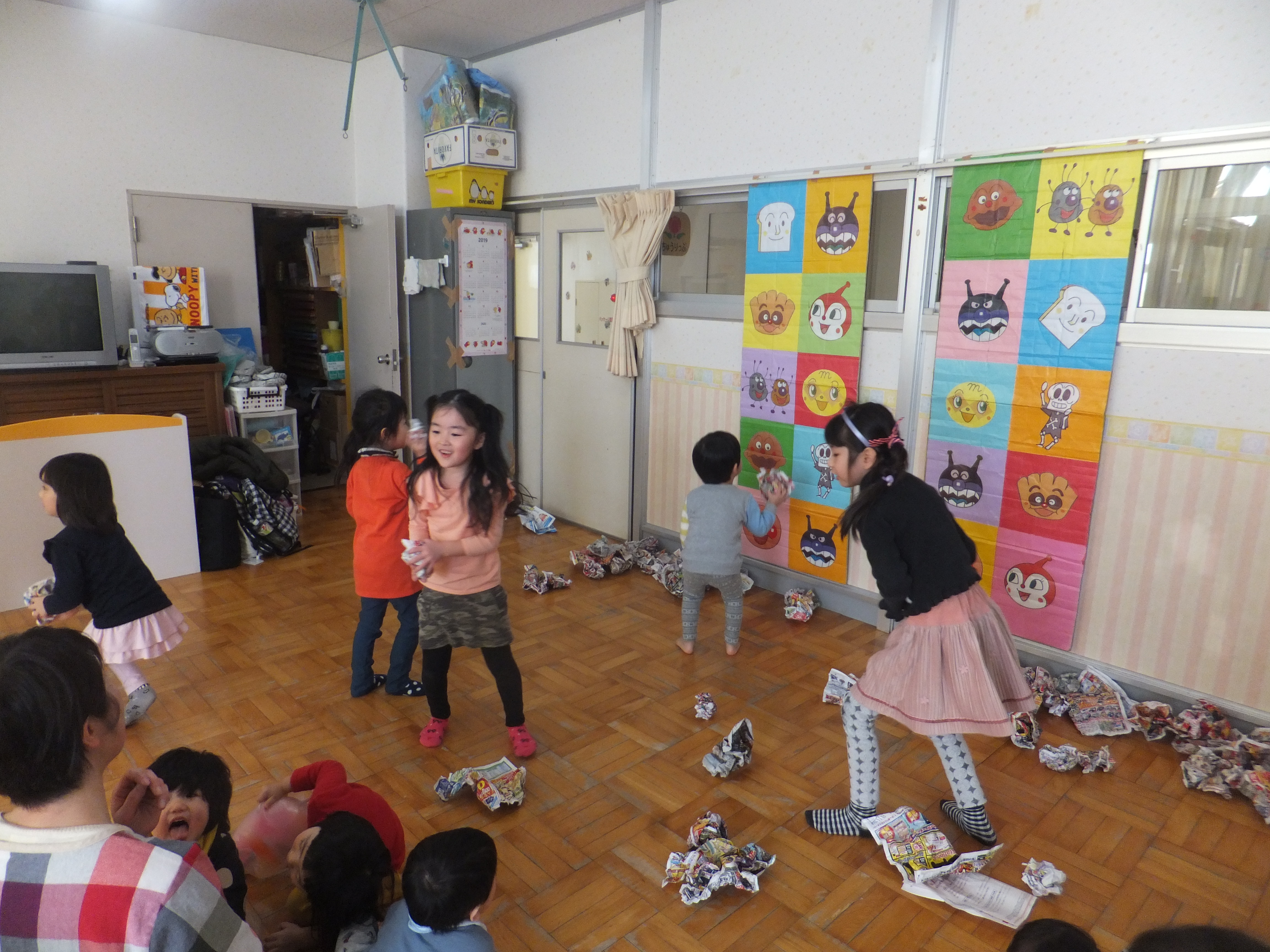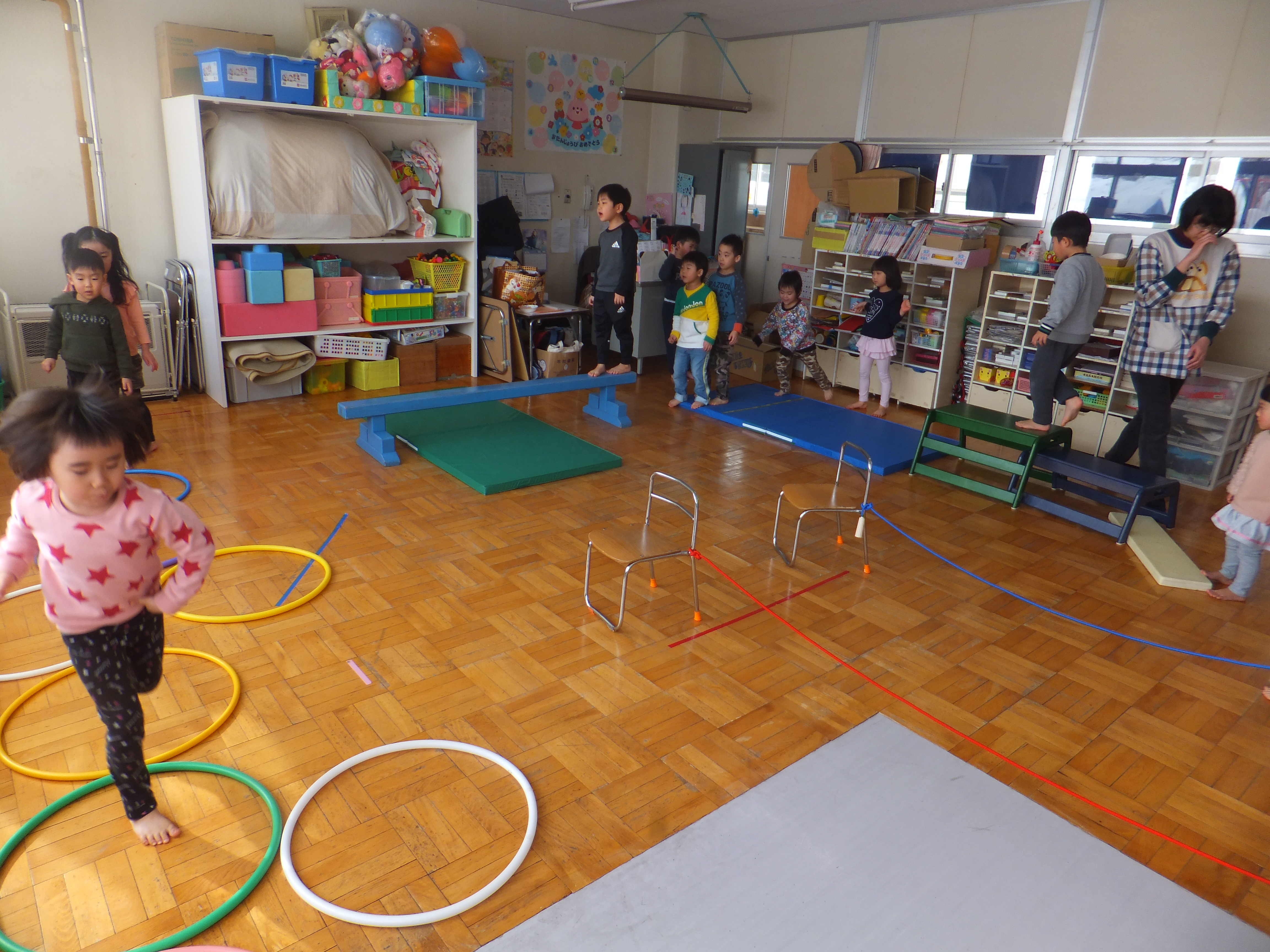 今日は自由保育がありました!ちゅうりっぷさんの部屋ではビニール袋にフラワーペーパーを丸めた物を入れた風船製作をしました!出来た風船を他のお友達と一緒に飛ばし合って仲良く遊んでいましたよ。すみれさんのお部屋では平均台や縄跳びを使ってサーキット遊びをしました。異年齢のお友達と順番を守りながら沢山体を動かして遊んでいました!