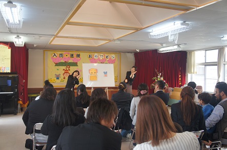 おうちの方と一緒に手遊びをしたり、お返事をしたり、笑顔も見られ20名の新入園児が仲間入りしました。