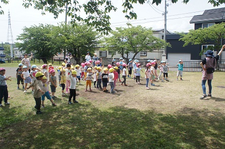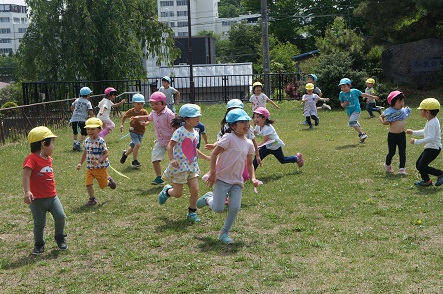 中央公園で運動遊びがありました。 前後左右ゲームやしっぽとりゲームを楽しむ姿が見られました。 その後の自由遊びでは、お友達や先生と鬼ごっこやかくれんぼなどを楽しんでいましたよ。