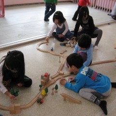 ブロックコーナー、ままごとコーナー、フラフープコーナー、木製トレインコーナーの4つのコーナーで、ひとりひとり好きなコーナーへ行き、遊びを楽しんでいました。兄弟・姉妹で、上の子が下の子の手をひき、一緒に遊ぶ姿も見られ、とてもほほえましかったです。