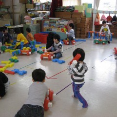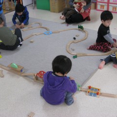 今月の自由保育は、新聞紙コーナー、ままごとコーナー、木製トレインコーナー、大型ブロックコーナーの4つのコーナーを設けて行いました。お友達といろいろなコーナーを回って好きな遊びを楽しんだり、異年齢のお友達と手をつないで歩いたりと笑顔で過ごす姿が見られていました。
