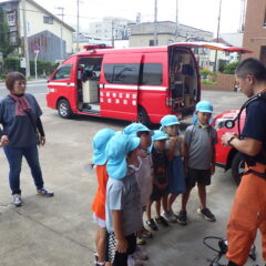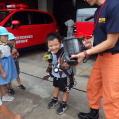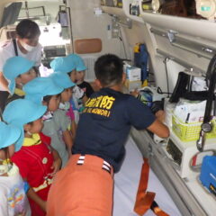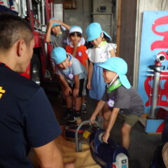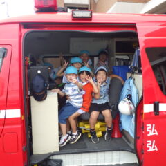 その後、2グループに分かれて消防車や救急車を見せてもらったり、実際に乗ったりして興味津々で楽しんでいました。