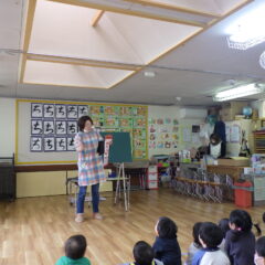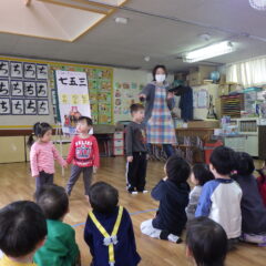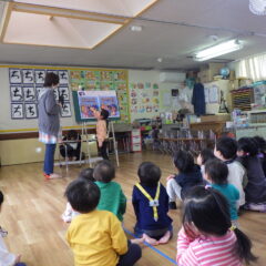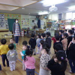 すみれ組保育室に全クラス集まり、七五三についてのお話を聞いたり、七五三のイラストのまちがいさがしをして、楽しんで参加していました。