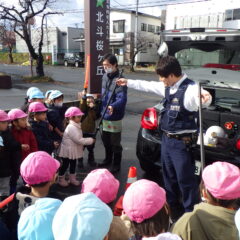 お巡りさんからお仕事の話や、使っている道具の説明を受けたり、実際に持ってみたりしてとても喜んでいました。