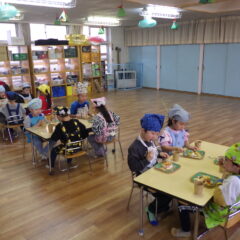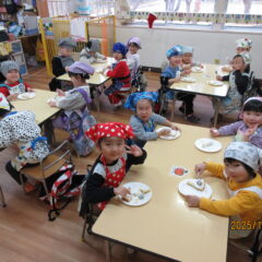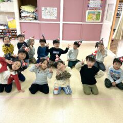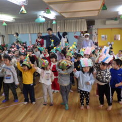全クラスのお友達が、自分達で作った帽子をかぶり、嬉しそうにしながらすみれ組保育室に集まると、ドキドキ・ワクワクしながら楽しんで参加し、歌ったり踊ったりしていました。