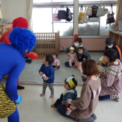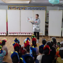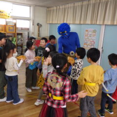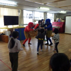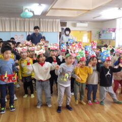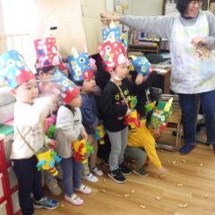 各クラス自分達で作った鬼のお面をかぶり、すみれ組保育室に集まり元気に朝の歌や豆まきを歌って始まった集会。