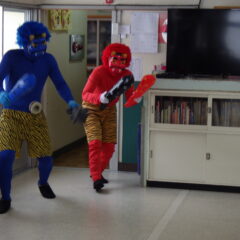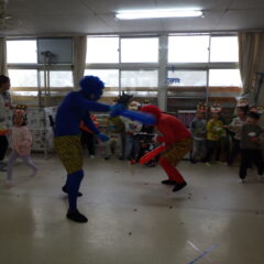 各クラスのお面の紹介や由来を聞いて、みんなで「おにのパンツ」を踊ったまではみんな笑顔でしたが・・・。各クラスへ戻り、豆入れの準備を始めるとしだいに表情に変化が見られ、鬼の登場に大号泣したり、必死に豆を投げて戦ったりと様々な様子が見られていました。
