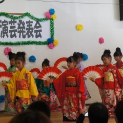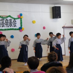清水公民館祭りで、年長組さんが日本舞踊を発表してきました。何度か発表していくうちに、顔つきもりりしくなってきた男の子、ますます可愛らしくなってきた女の子。難しい扇子使いも上手になり、踊りも揃うようになってきました。今回もお客さんからたくさんの拍手をもらい、とても嬉しそうな笑顔を見せていたすみれ組さんでした。