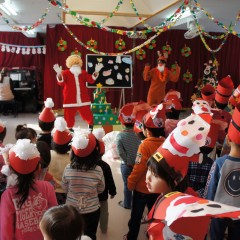 サンタクロース来るかな~?とずっと楽しみにしていたクリスマス会。お楽しみにを見たあとにサンタさんが登場すると大喜びしていました。