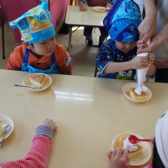 クリスマスクッキングは、3.4.5歳児がスポンジケーキにクリームとフルーツ、チョコのトッピングをして楽しみました。お友達と一緒に工夫して作り、「おいしい~!!」と嬉しそうに食べていましたよ。