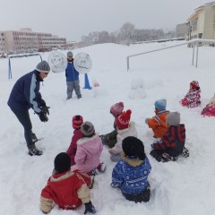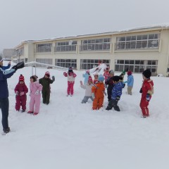 寒さに負けず元気いっぱい雪遊びを楽しみました。2チームに分かれての的当てやリレーでは、嬉しい顔やくやしい顔など様々な表情が見られました。