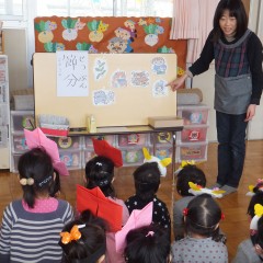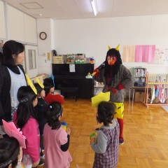 自分たちで製作した鬼のお面をつけて、節分集会に参加しました。保育士に紙芝居を読んでもらうと節分の由来に興味を持ち、日本の伝統に関心を示していました。「鬼は外~!!福は内~!!」っと元気な掛け声と共に、自分の心の中にいる鬼を退治する様子が見られていました。